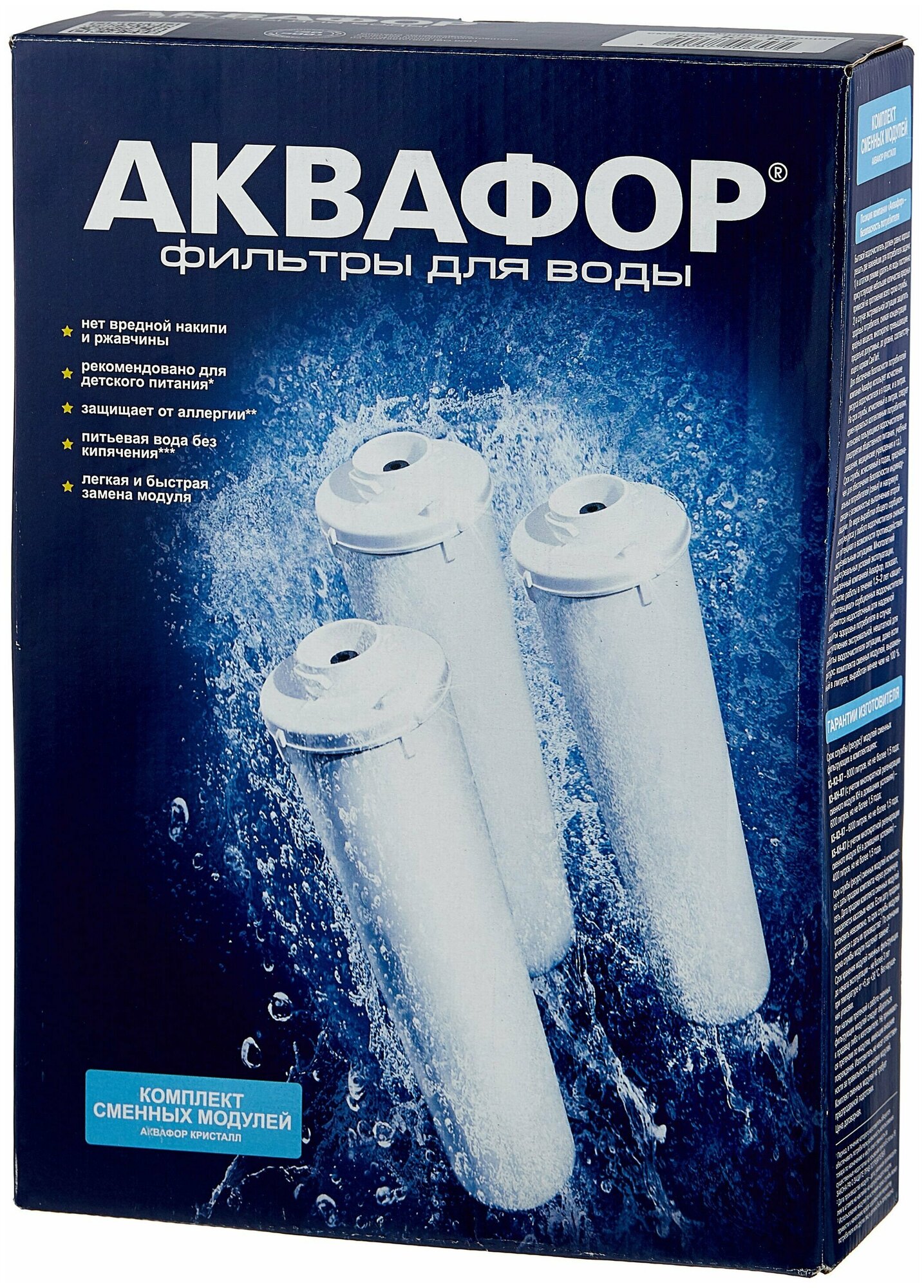 | Дополнительная информация | для фильтра Кристалл А; в комплекте три модуля: K5 - предварительная очистка; K2 - глубокая фильтрация; K7 - финишная очистка |