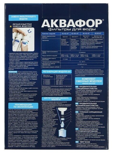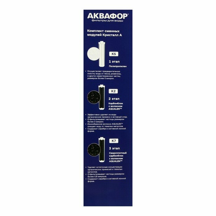 | Дополнительная информация | для фильтра Кристалл А; в комплекте три модуля: K5 - предварительная очистка; K2 - глубокая фильтрация; K7 - финишная очистка |