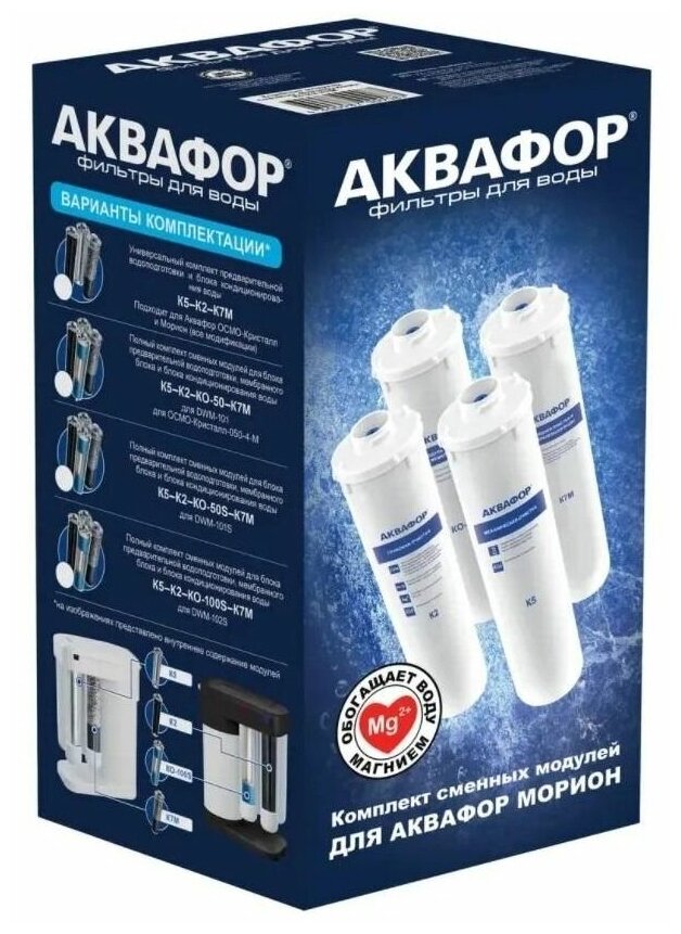 | Дополнительная информация | для фильтров DWM-102S / DWM-201 Морион; в комплекте четыре модуля: K5 - предварительная очистка; K2 - глубокая фильтрация; K-100S - обратноосмотическая мембрана; K7M - постфильтрация и минерализация |
