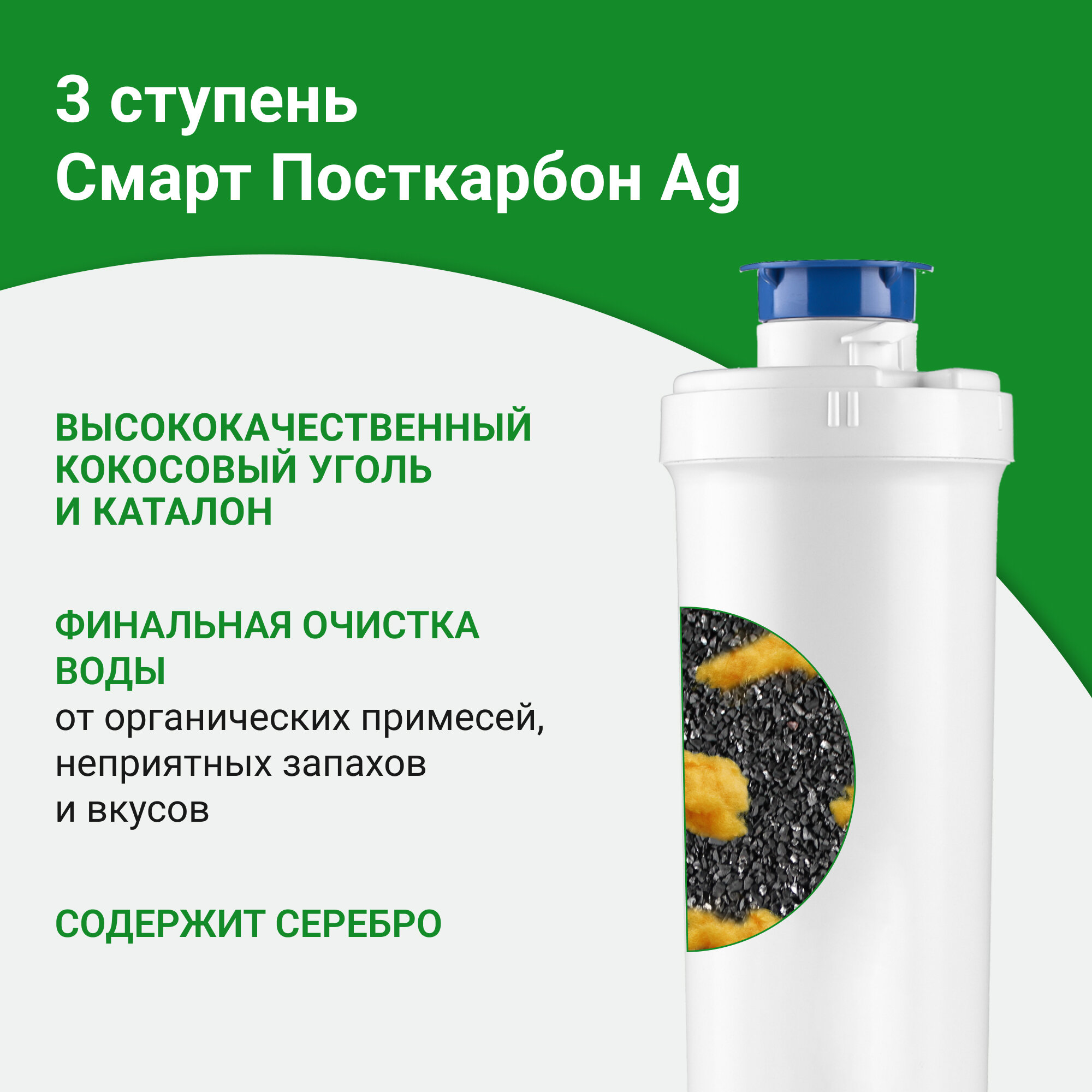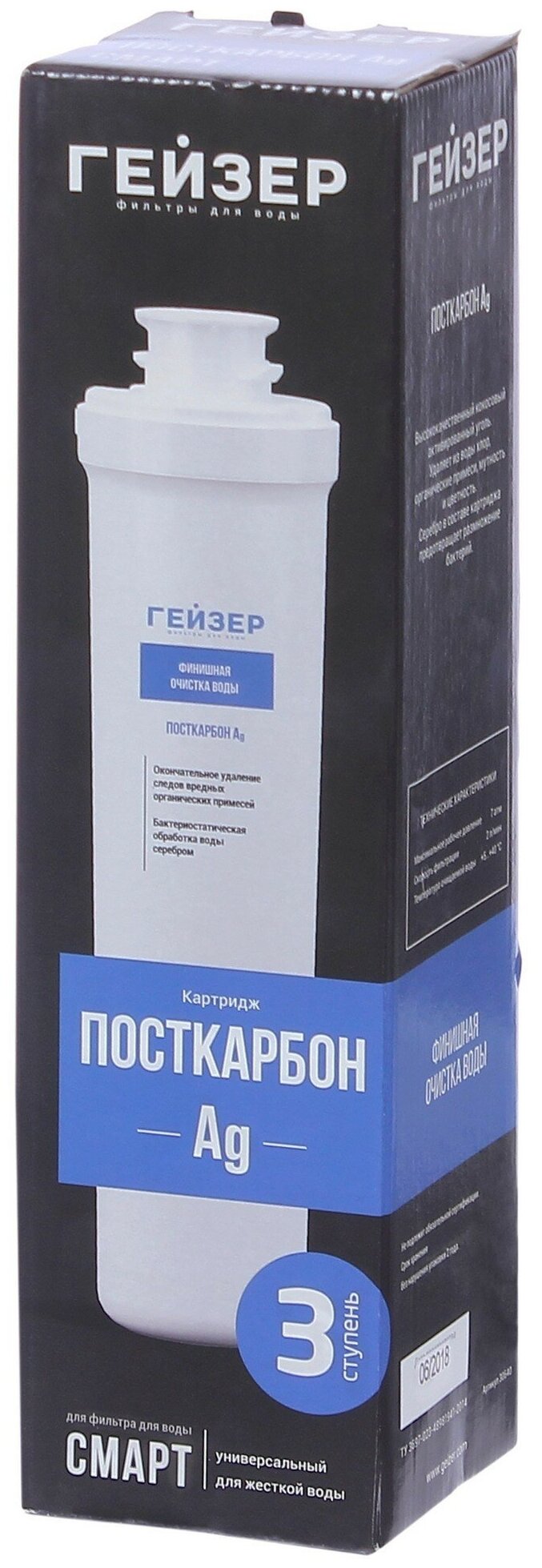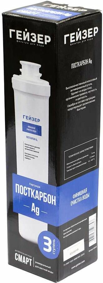 Сменный картридж Гейзер Посткарбон AG Смарт, применяется в бытовых фильтрах Смарт Универсальный и Смарт для жёсткой воды, 30640
