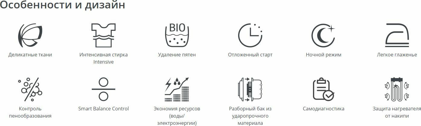 | Дополнительные функции | контроль баланса / отложенный старт / контроль за уровнем пены / выбор скорости отжима / выбор температуры стирки / интеллектуальное управление стиркой |
