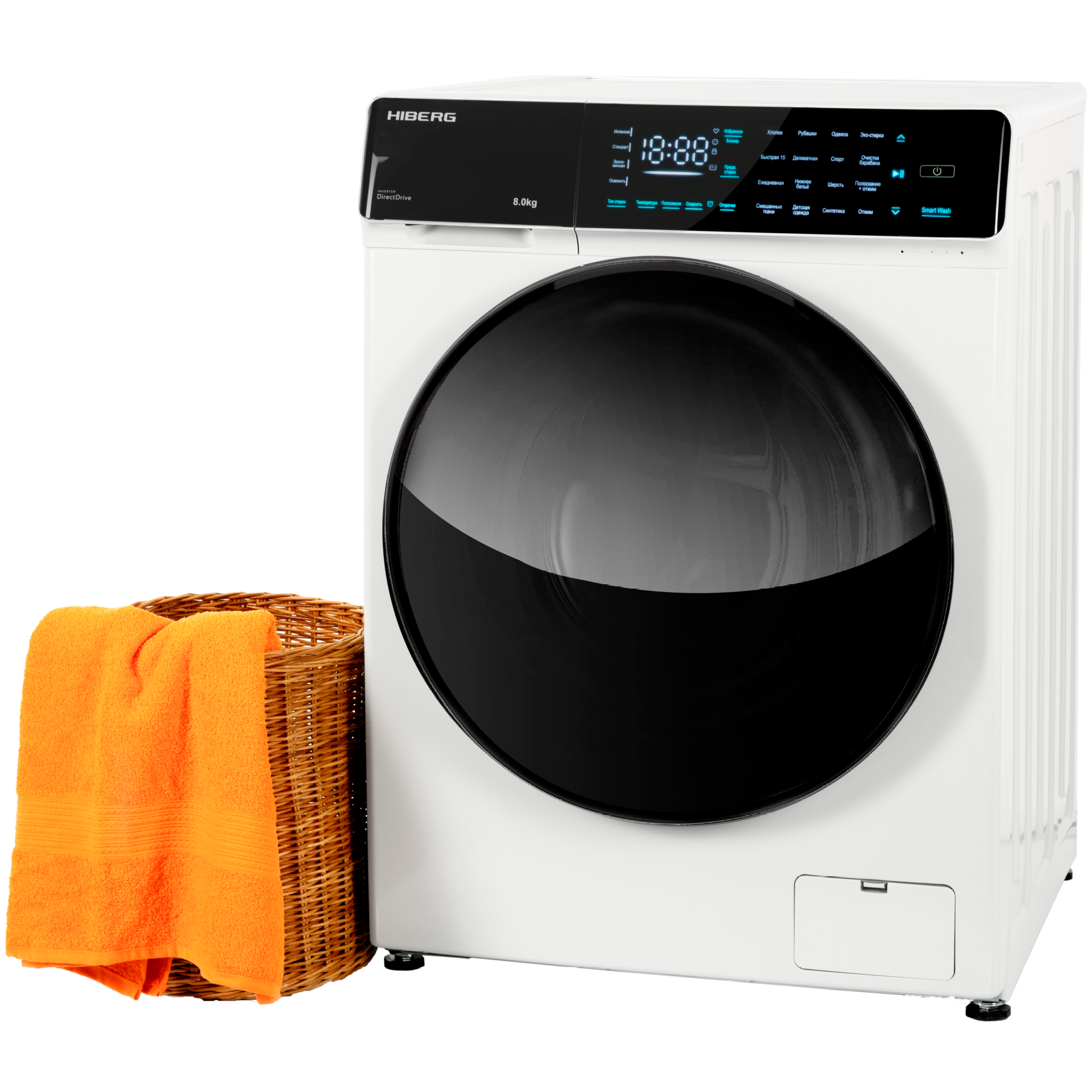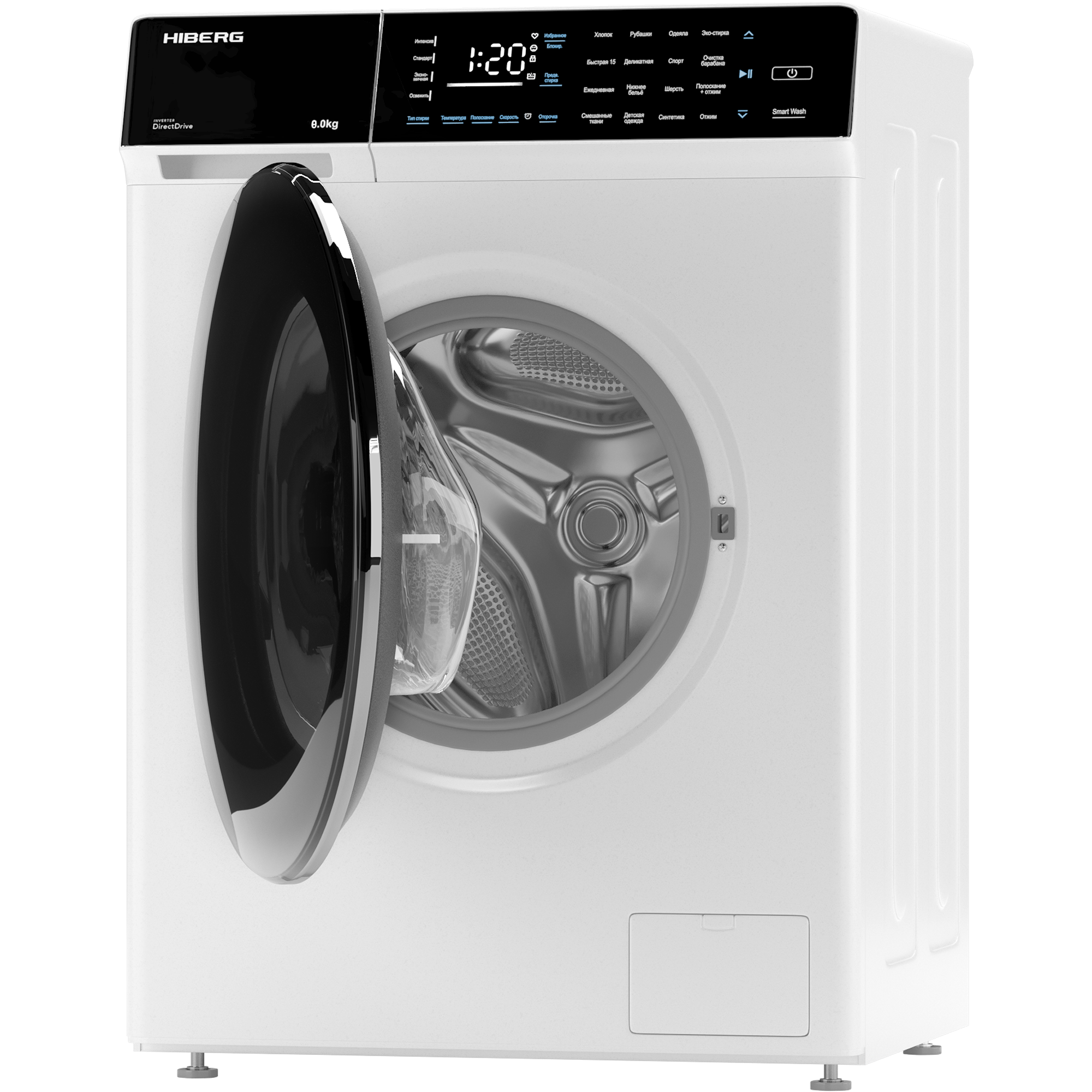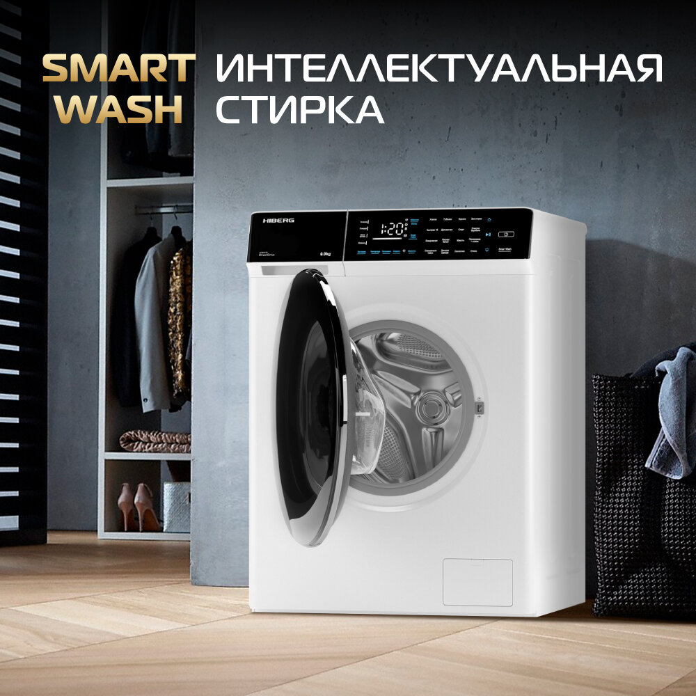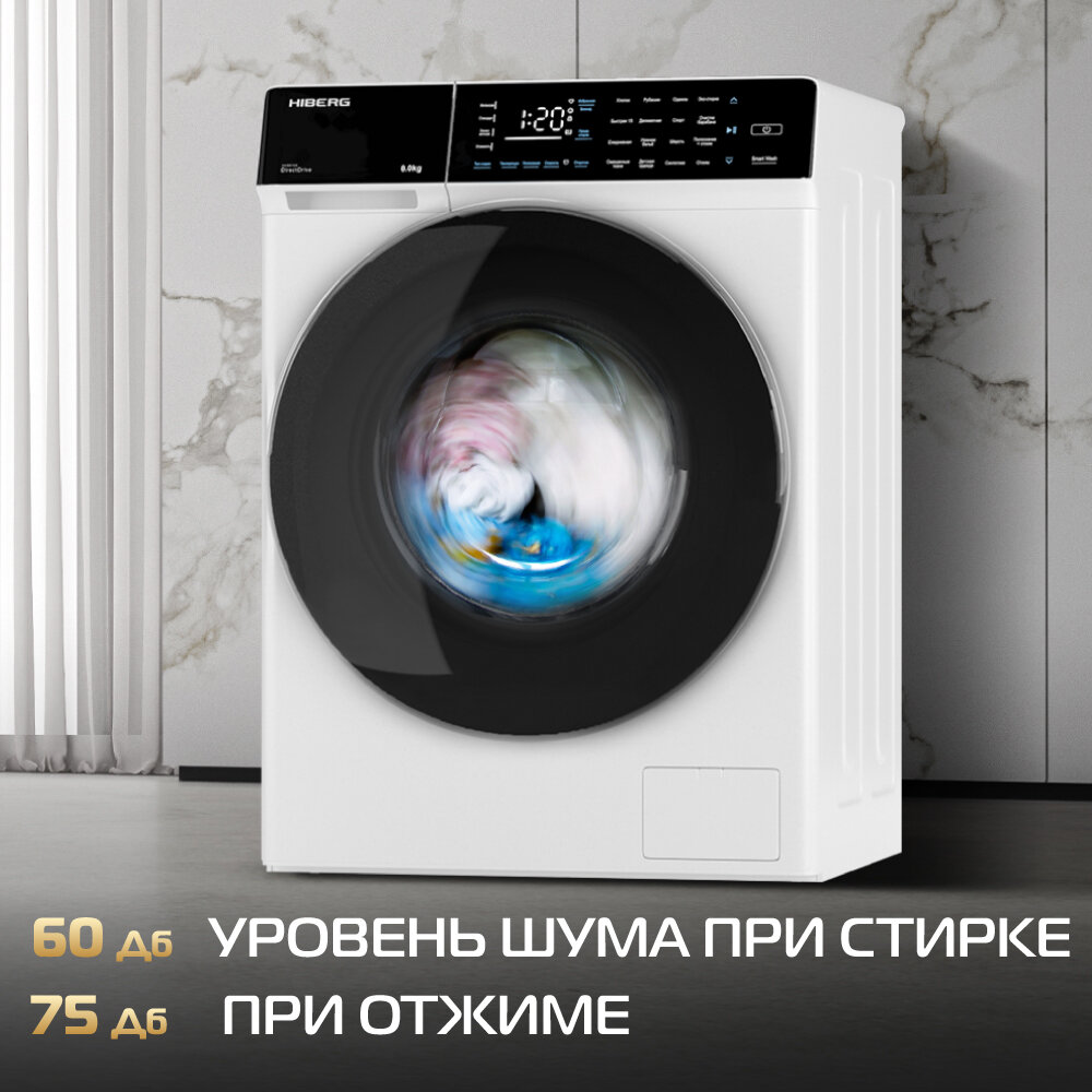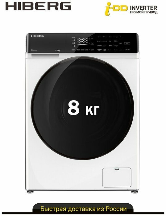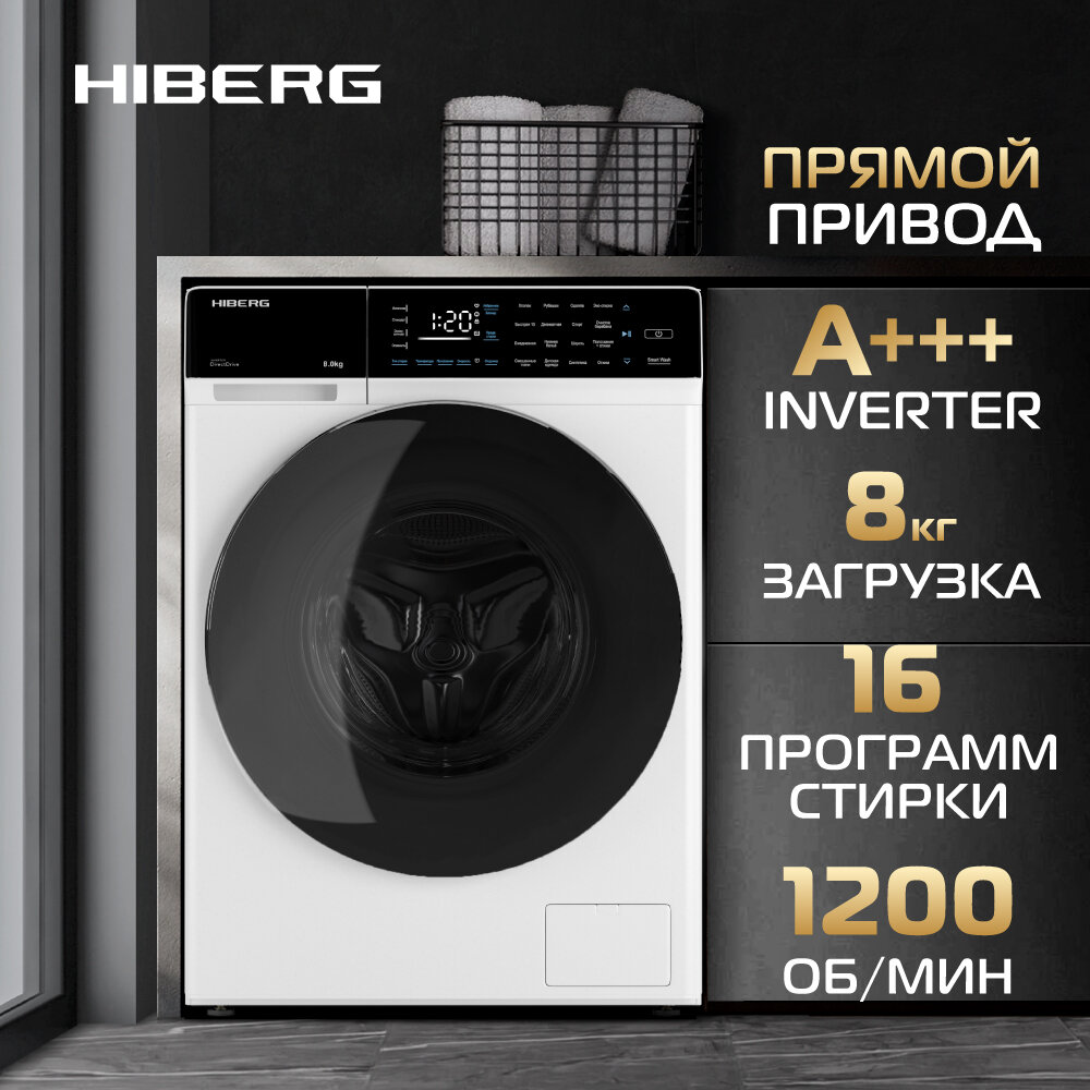 Стиральная машина HIBERG i-DDQ9 - 812 W, инверторная, 8 кг загрузка, 1200 об/мин, 16 программ, Smart wash, таймер, белый