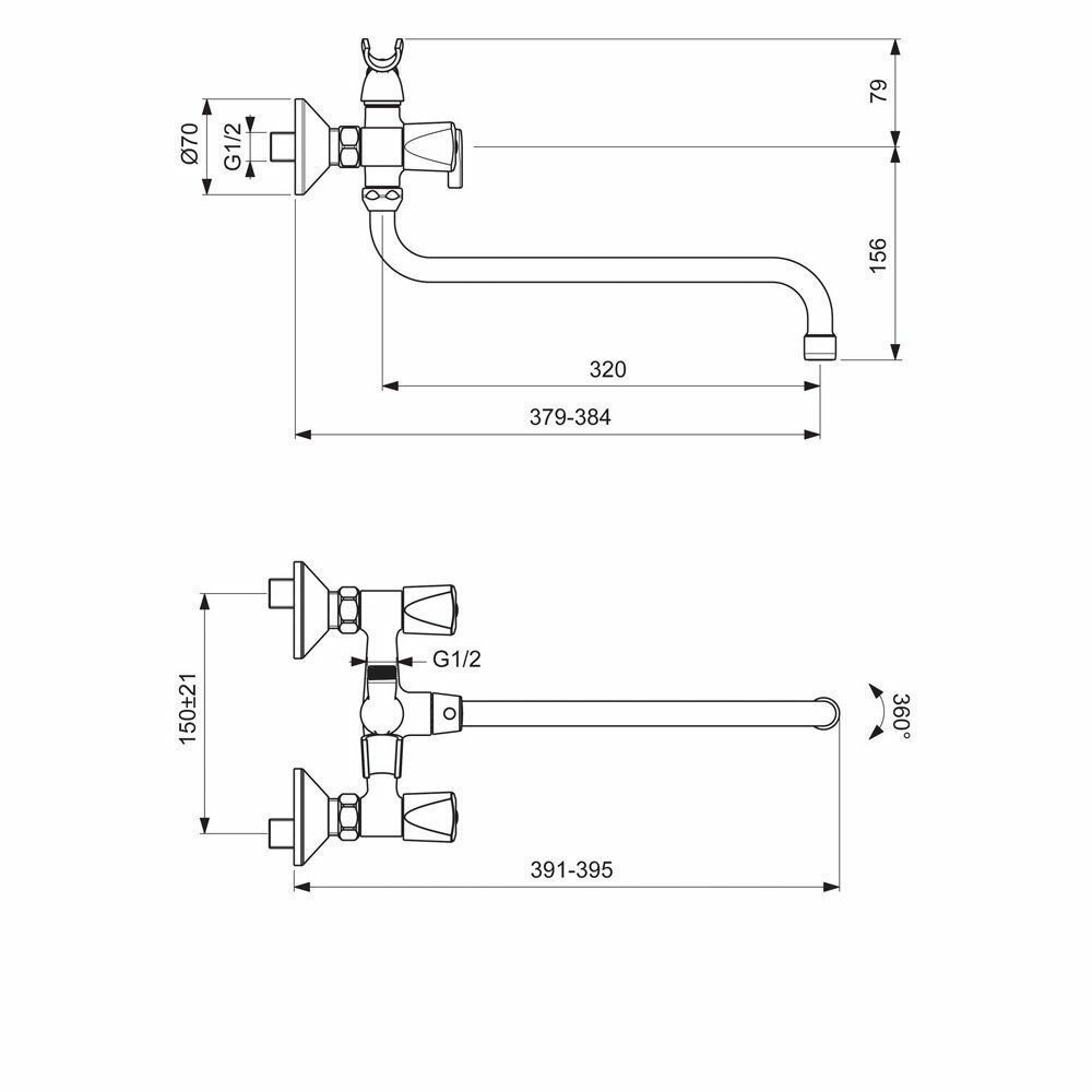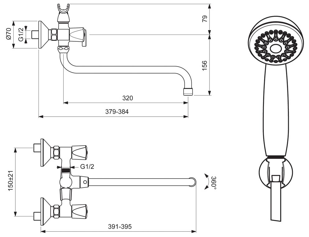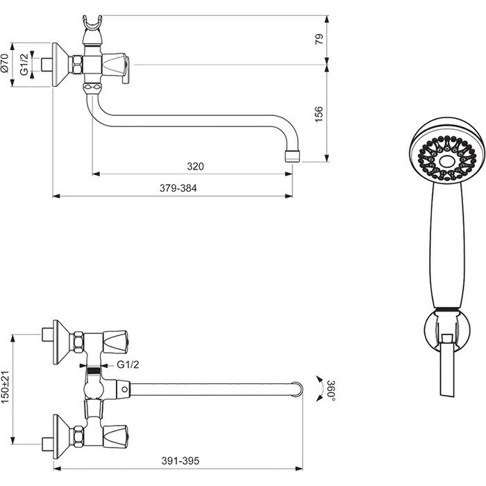 | Дополнительная информация | монтаж на стандартных эксцентриках; материал рукоятки: высокопрочный пластик; угол поворота излива 360°; аэратор Perlator; система защиты рукоятки от нагревания Comfort Touch; душевая лейка Ø70 мм |