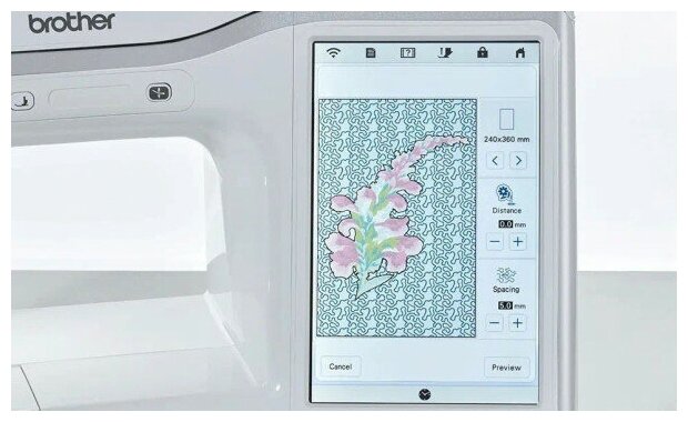 | Дополнительная информация | беспроводное подключение к мобильному приложению My Design Snap для создания, импорта и позиционирования вышивальных дизайнов, функция автоматического подбора вариаций цветовых схем Colour Shuffling,функция наметки, My Design Center - программа для создания своих собственных дизайнов на экране, датчики нитей |