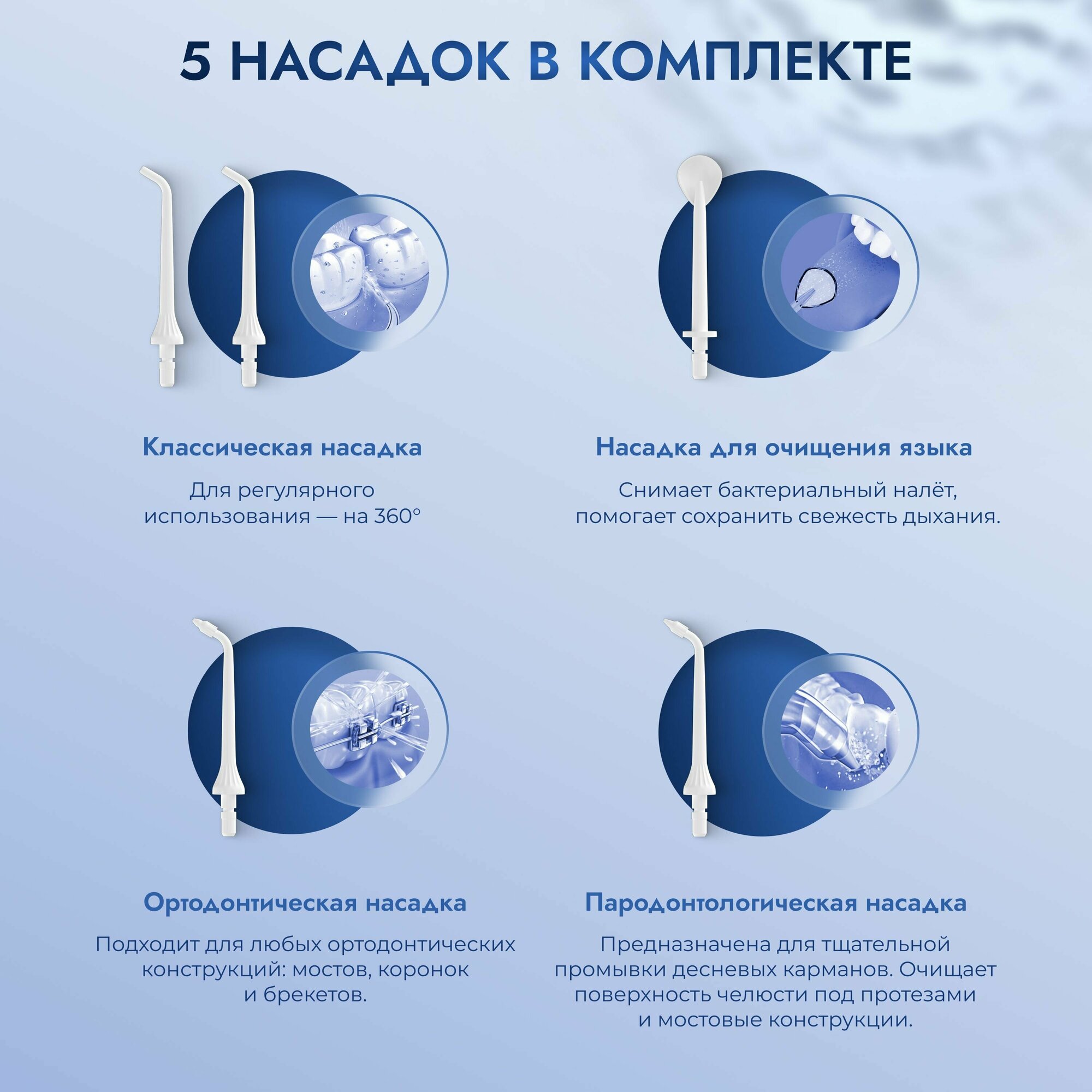 | Подробная комплектация | Насадка для снятия налеты с языка Насадка для пародонтального кармана Ортодонтическая насадка Стандартная насадка для повседневной очистки - 2шт Инструкция на русском языке Кабель Type-C |