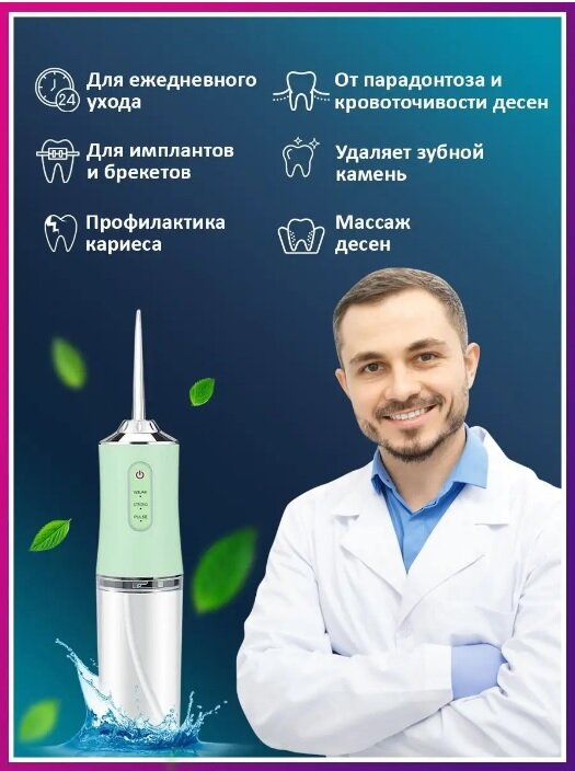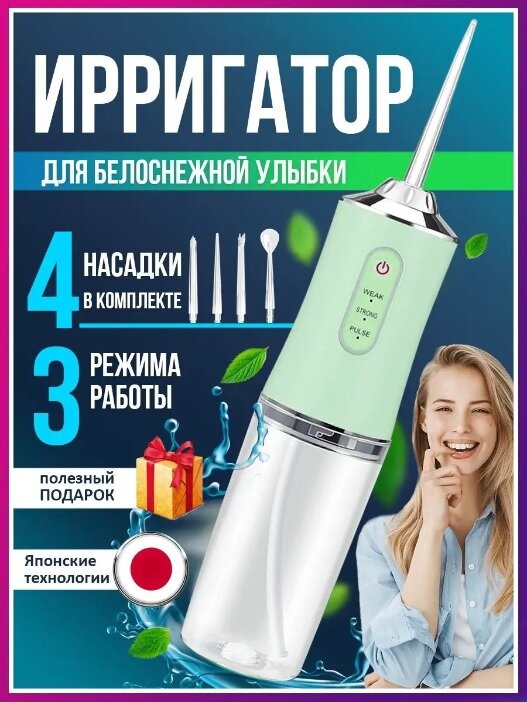 Ирригатор для зубов и полости рта GCL G-1112, портативный для повседневной и деликатной чистки c 4 насадками, уход за деснами, зеленый интересное: