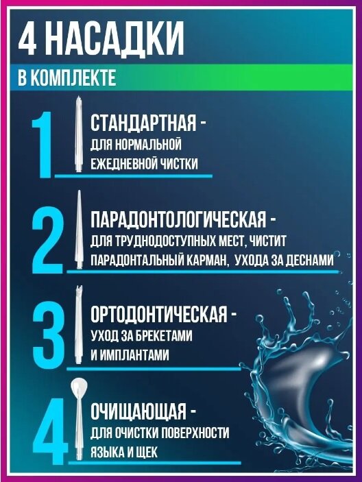 Компактная модель. Под высоким давлением струя удаляет все остатки еды, зубки получаются очень чистые и блестящие. Десны не кровоточат, не повреждаются. Необходимо для тех, у кого слабые десны. Чистится все очень аккуратно и безболезненно. 3 режима работы. Есть дополнительные насадки.