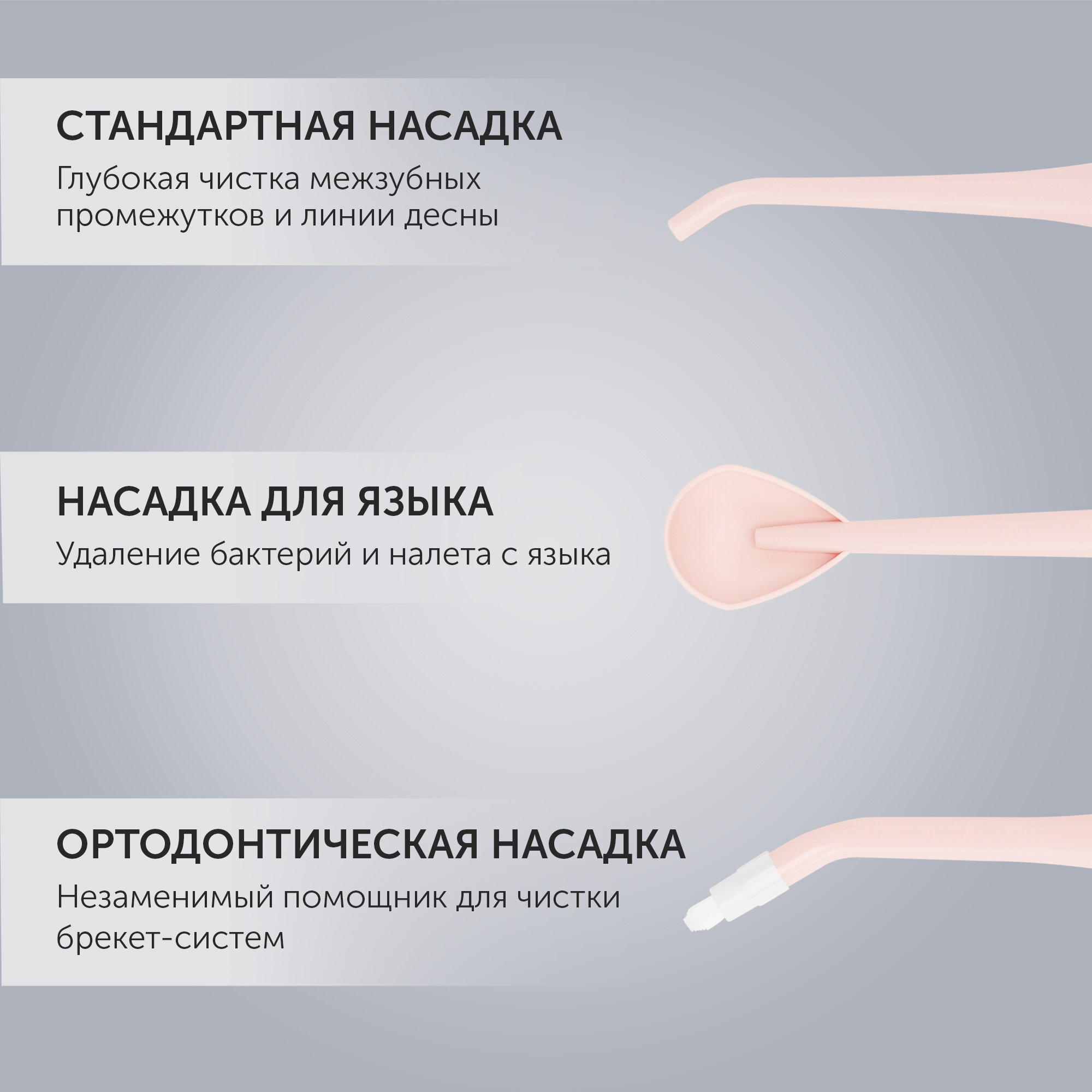 | Насадки | для струйной чистки / для чистки языка / ортодонтическая (для брекетов) |