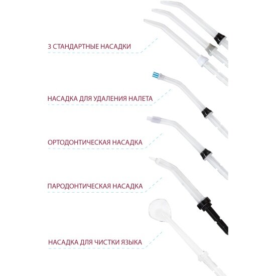 | Насадки | для струйной чистки / для чистки языка / пародонтологическая (для десен) / ортодонтическая (для брекетов) |