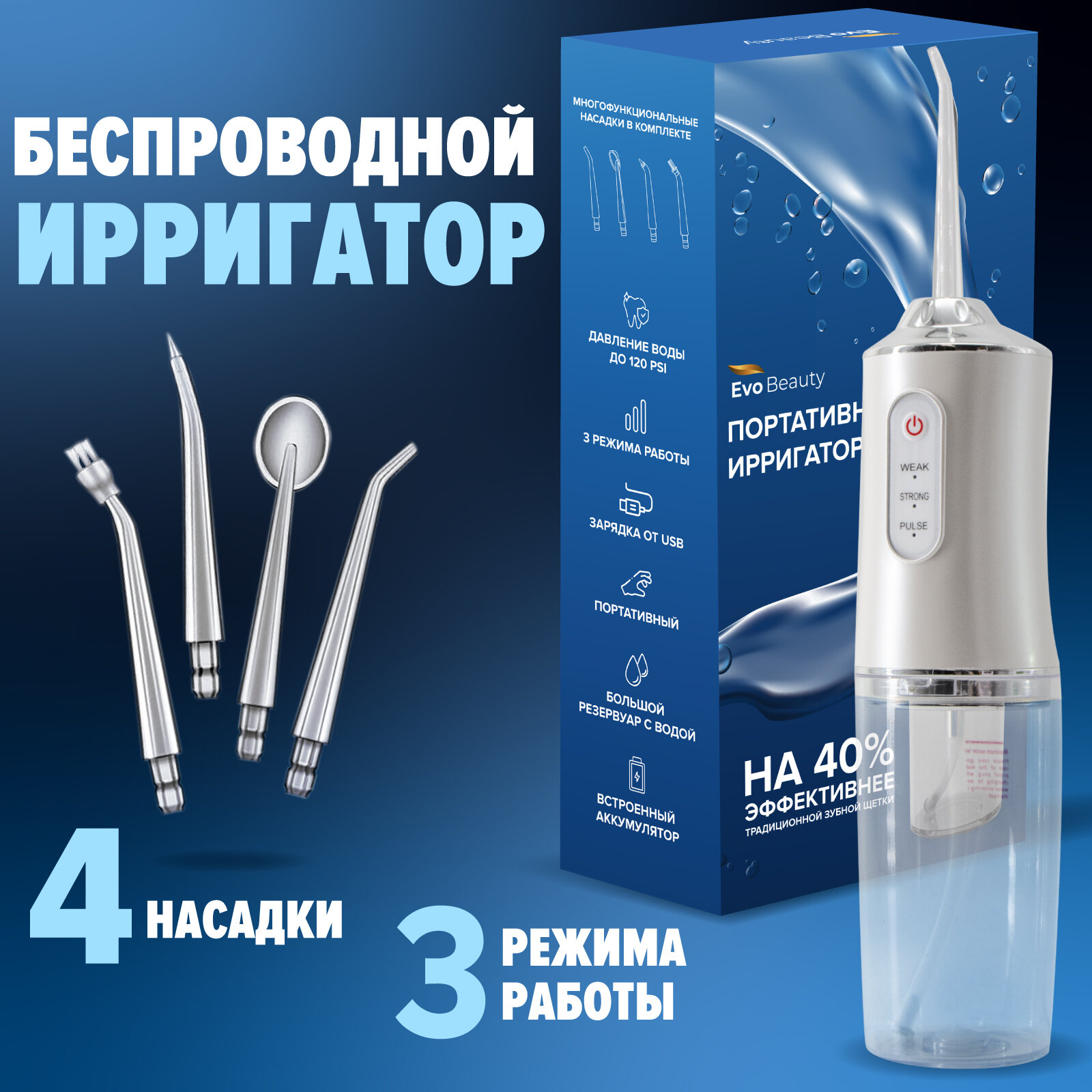 Ирригатор для полости рта портативный. Ирригатор для зубов портативный беспроводной, для очистки зубов Evo Beauty, для брекетов,десен. 4 сменные насадки