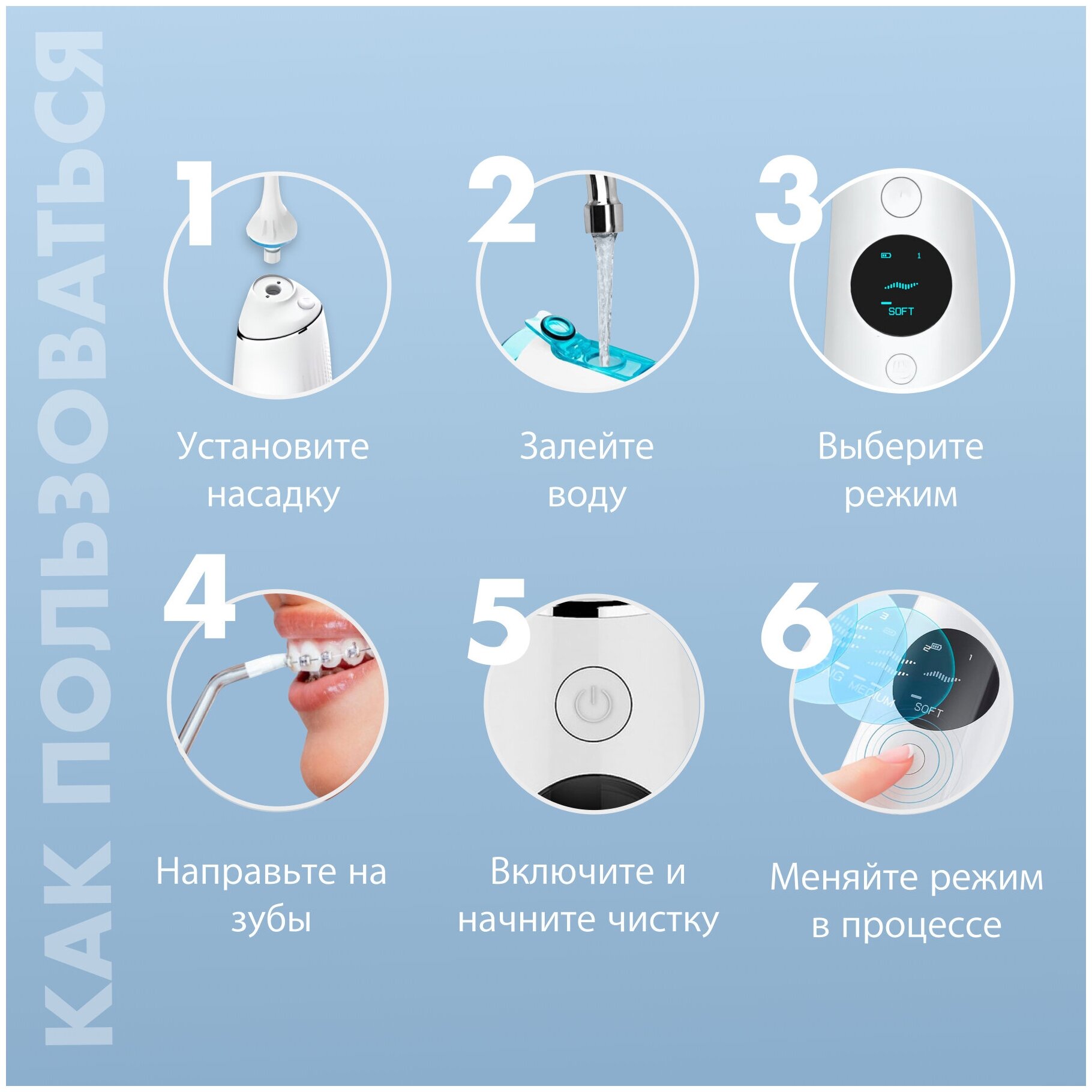 | Подробная комплектация | 1x - Ирригатор, 1x - Резервуар, 6x - Насадок, 1x - Чехол для насадок |