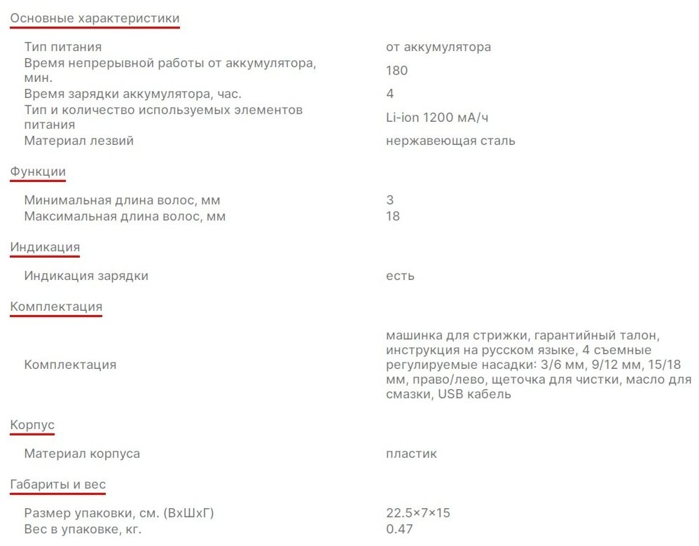| Дополнительная информация | машинка для стрижки, гарантийный талон, инструкция на русском языке, 4 съемные регулируемые насадки: 3/6 мм, 9/12 мм, 15/18 мм, право/лево, щеточка для чистки, масло для смазки, USB кабель |