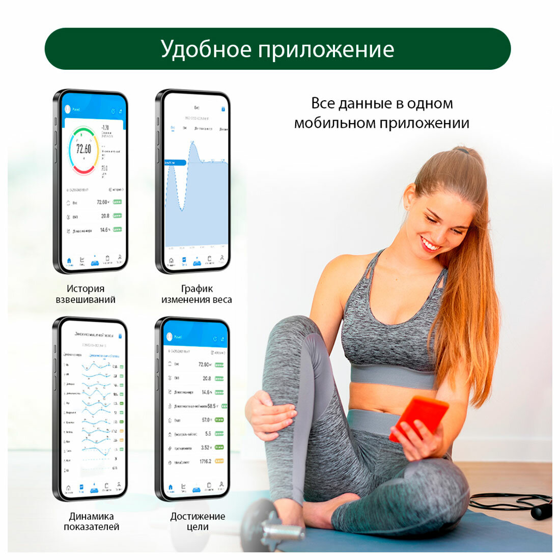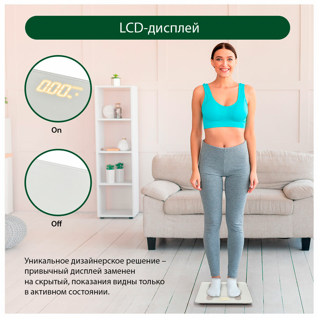 | Дополнительные функции | определение доли жировой ткани / определение доли мышечной ткани / определение доли воды / определение доли костной ткани / расчет ИМТ (BMI) / постановка цели / память |