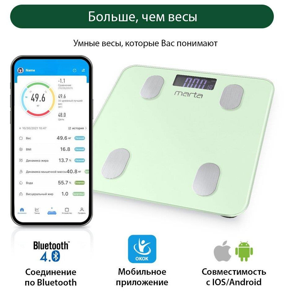 Весы (MARTA MT-1683 зеленый нефрит LCD весы напольные диагностические, умные с BLUETOOTH)