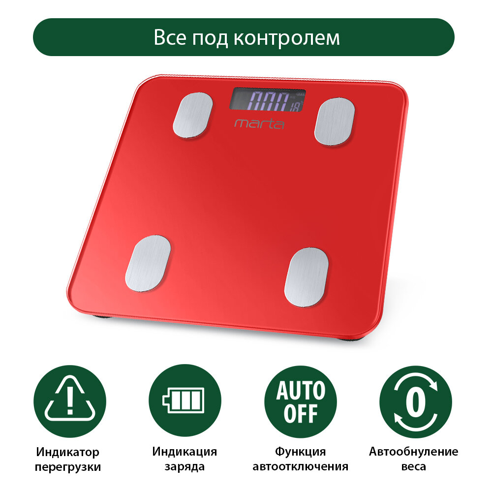 Умные весы MARTA MT-1683, красные, максимальная нагрузка 180кг, синхронизация со смартфоном