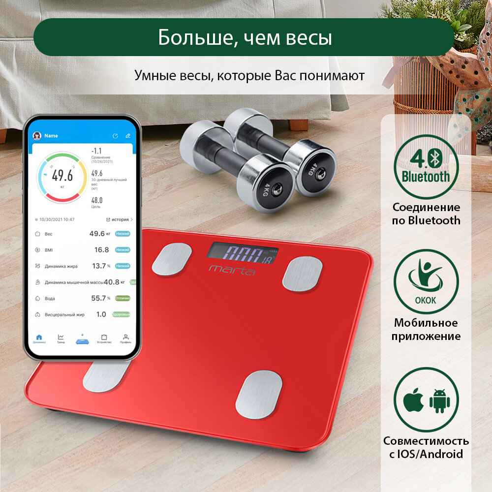 MARTA MT-1683 красный рубин LCD весы напольные диагностические, умные с Bluetooth