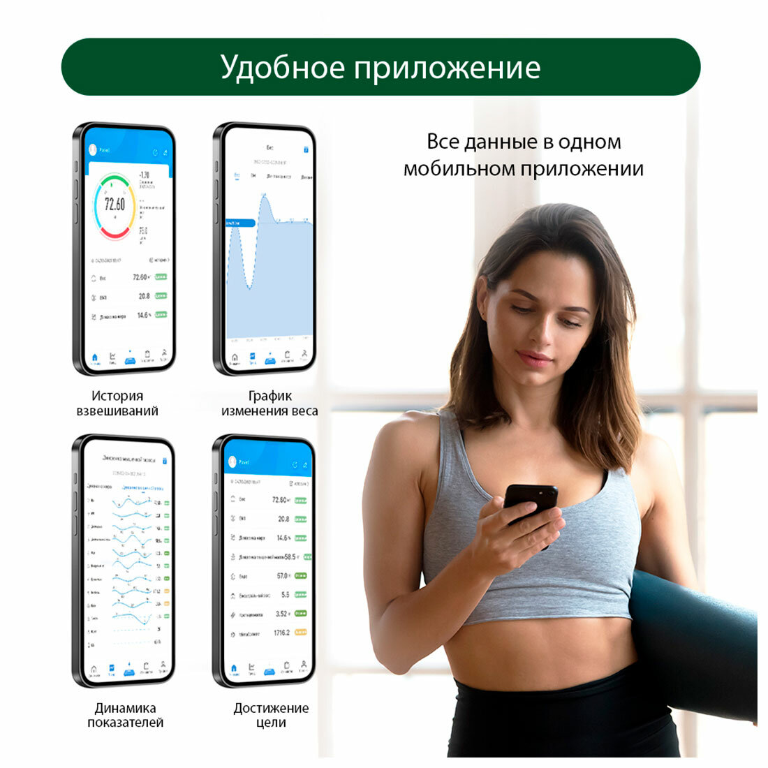 | Дополнительные функции | определение доли жировой ткани / определение доли мышечной ткани / определение доли воды / определение доли костной ткани / расчет ИМТ (BMI) / измерение температуры воздуха / постановка цели / память |