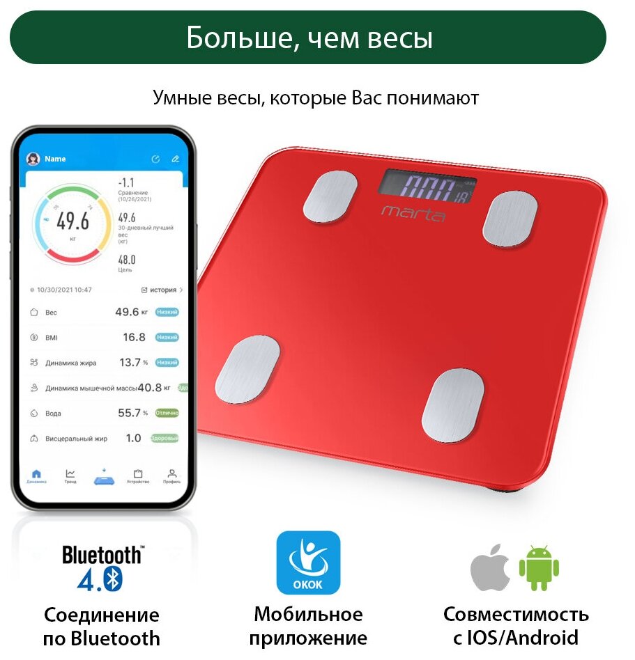 MARTA MT-1683 красный рубин LCD весы напольные диагностические, умные с Bluetooth