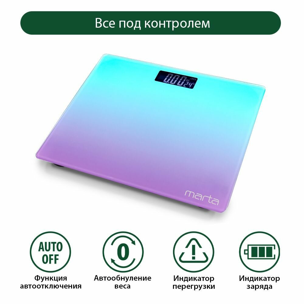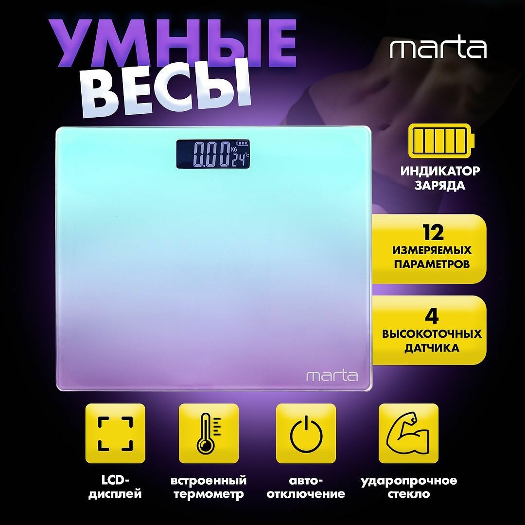 Купить MARTA MT-SC1691 лилово-бирюзовый LCD весы напольные диагностические, умные с Bluetooth