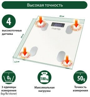 Весы напольные Marta MT-1683 белый жемчуг стекло, 28*28 см, 4 сенсора, ЖК диспл, память на 8 чел, из .