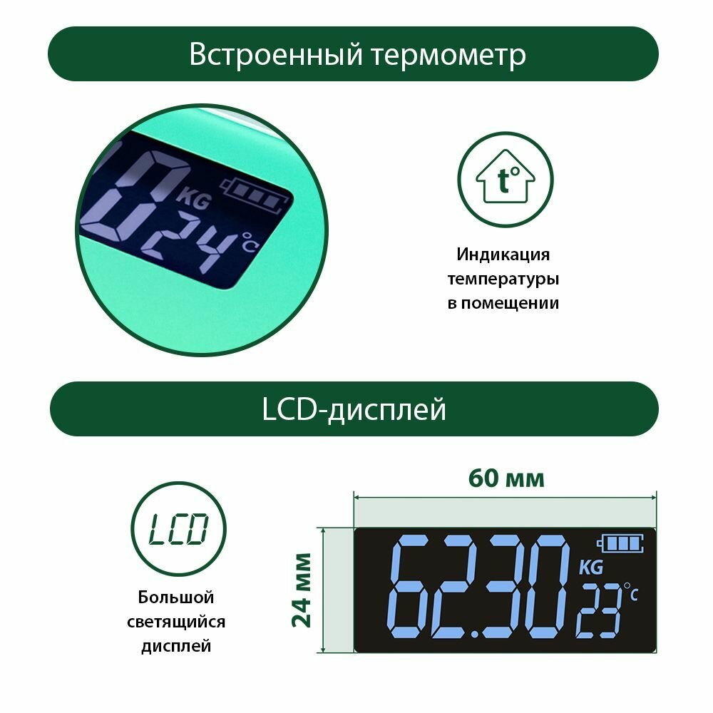 | Дополнительные функции | определение доли жировой ткани / определение доли мышечной ткани / определение доли воды / определение доли костной ткани / расчет ИМТ (BMI) / измерение температуры воздуха / постановка цели / память |