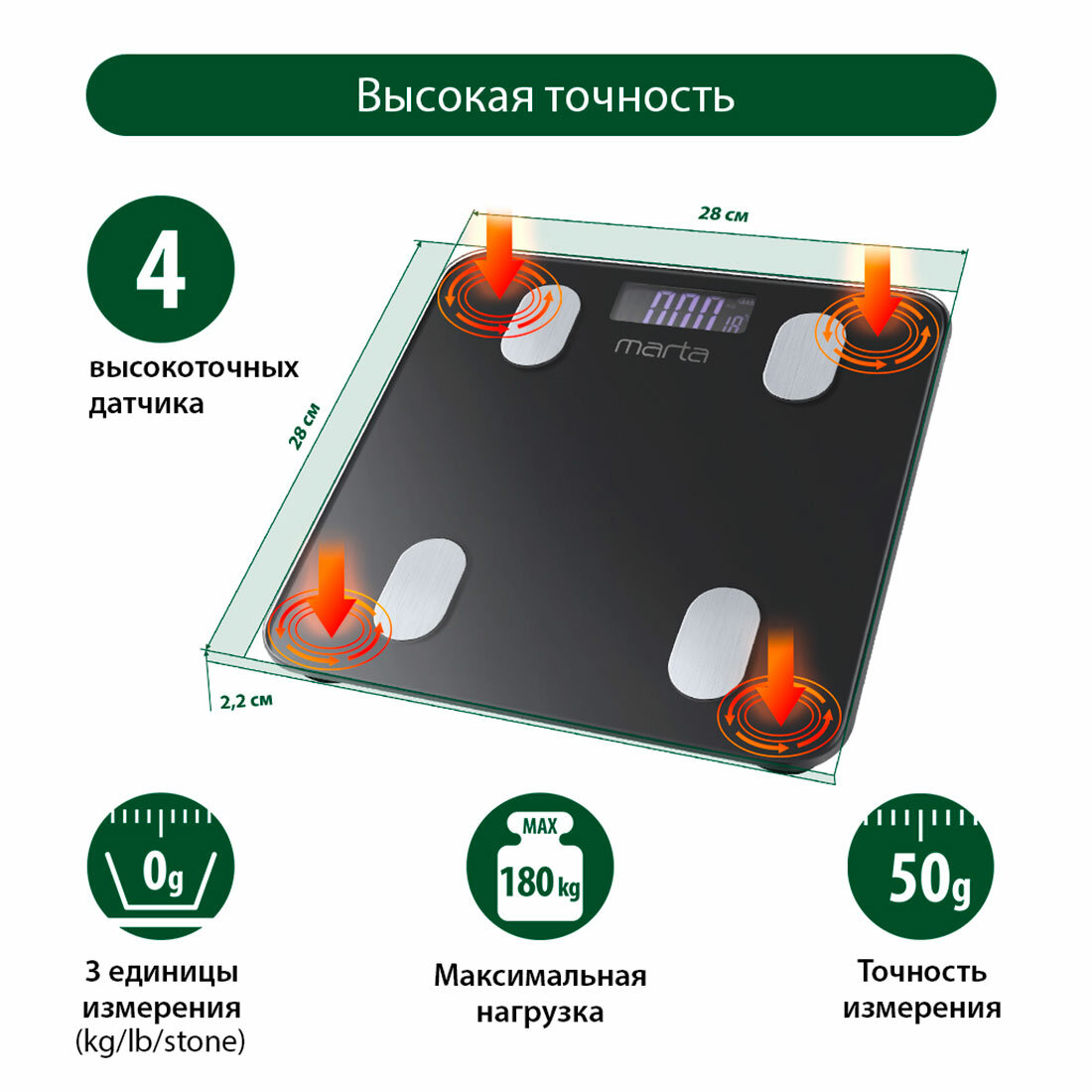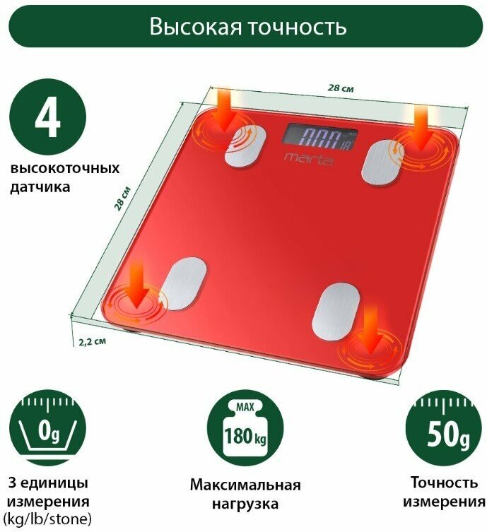 Весы напольные Marta MT-1683 черный жемчуг стекло, 28*28 см, 4 сенсора, ЖК диспл, память на 8 чел, и .