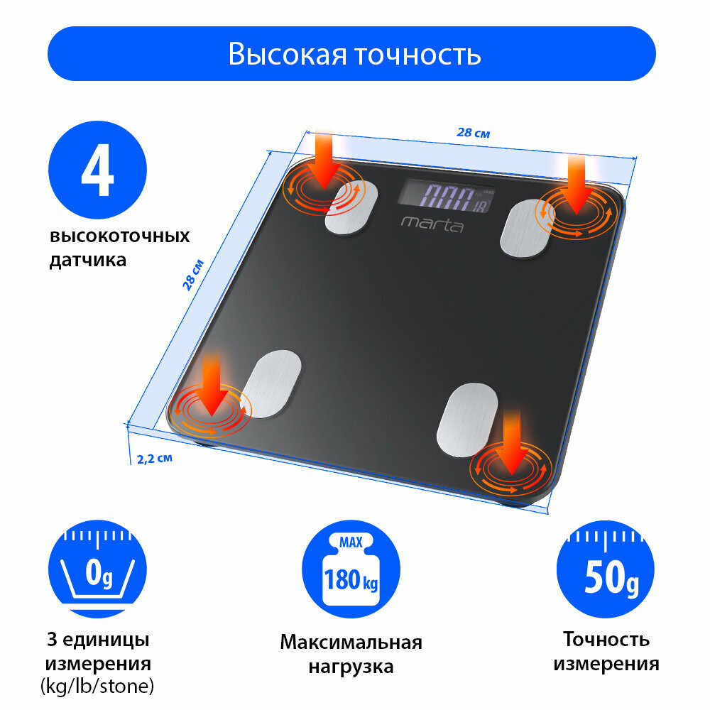 Весы напольные MARTA MT-1683 черный жемчуг LCD диагностические, умные с Bluetooth
