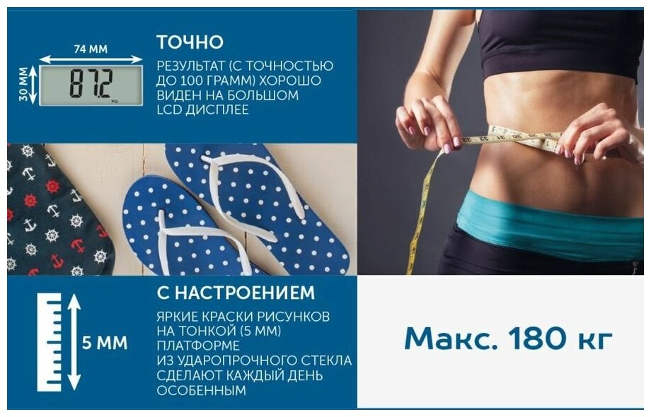 | Отзыв: | Весы купила для контроля веса перед соревнованиями. Я влюбилась в их яркий летний дизайн и цену. И вот уже 5 мес. нашего тандема) Их фишка в мотивирующем дизайне - в мечтах о лете объедаться просто кощунственно. Удобные прорезиненные ножки предотвращают скольжение на полу, а четкие цифры на табло отчетливо просматриваются. Рекомендую, на 5+) |