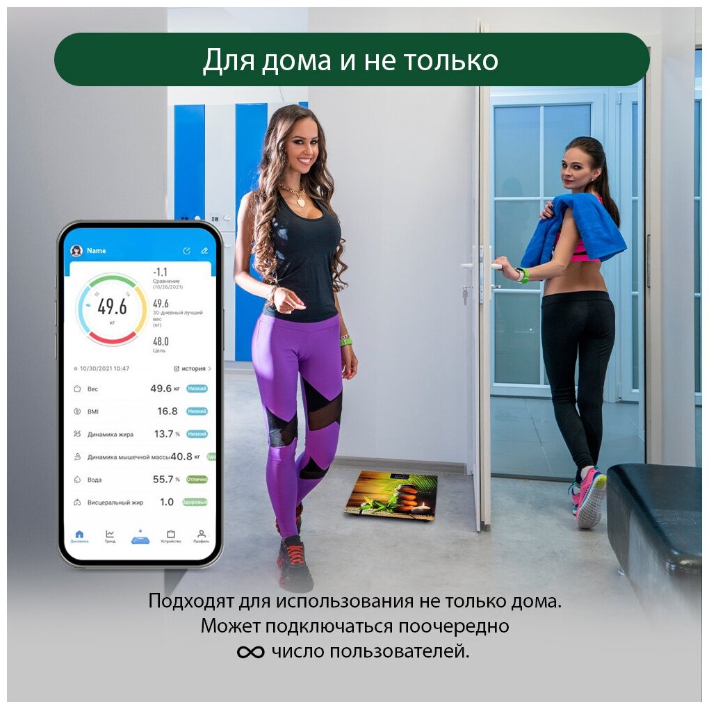 Отзыв: Покупала для себя и для мужа. У него Айфон, у меня Андроид, так вот ни у кого из нас вообще никаких проблем не возникло с подключением к приложению. Удивительно низко стоят эти весы, учитывая очень широкий функционал. Все показатели измеряются верно, в приложении можно отслеживать динамику, память имеется. Ну и самое главное, очень просто разобраться как ими пользоваться