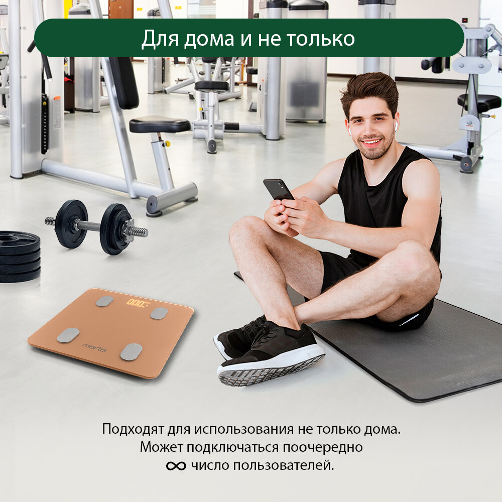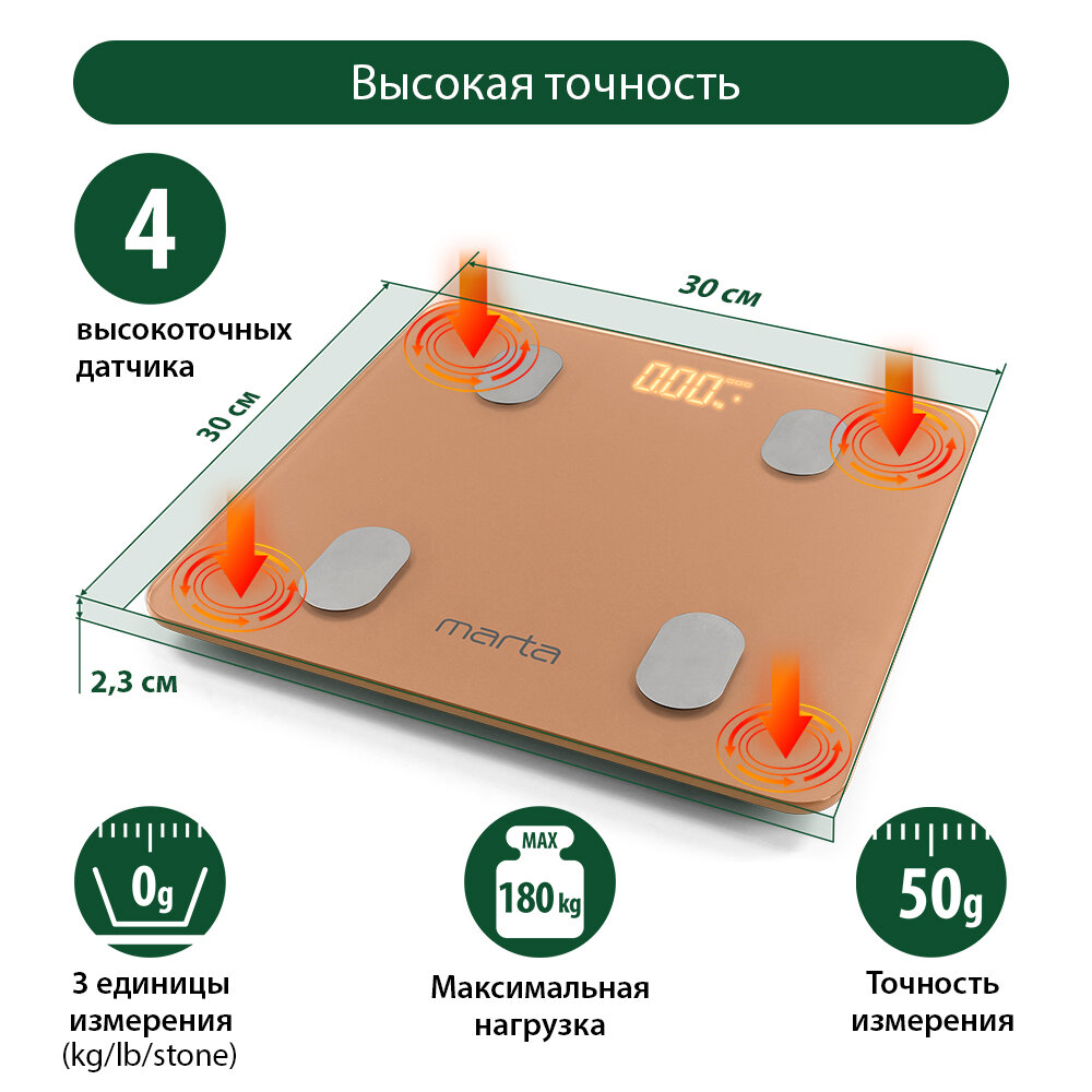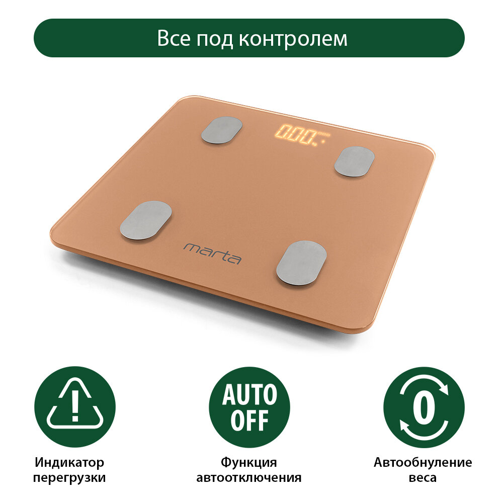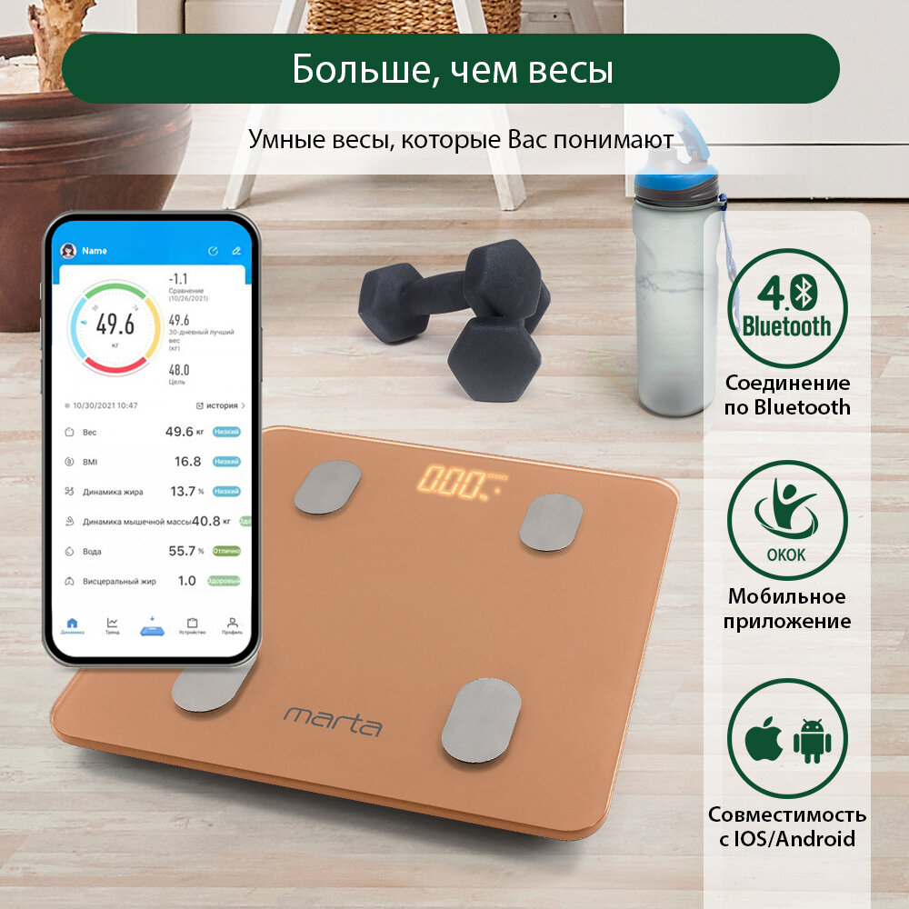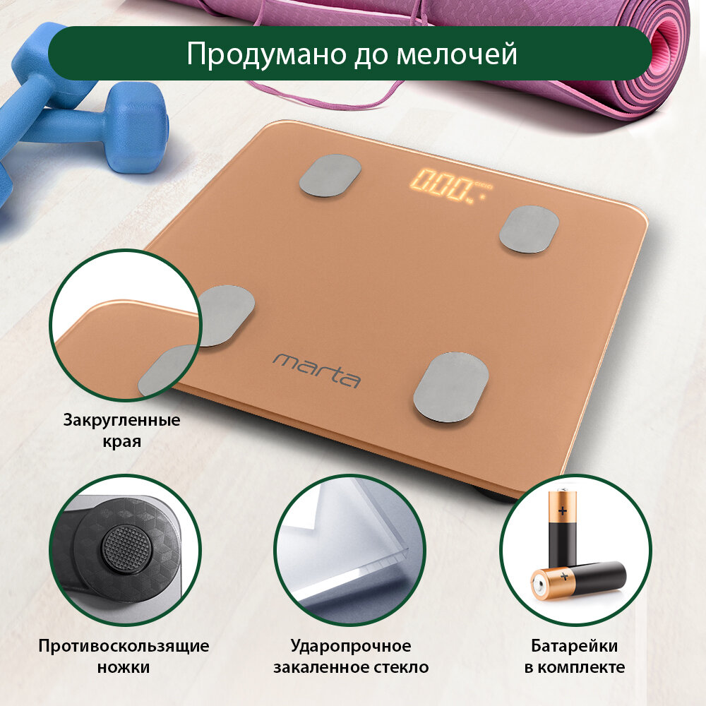 MARTA MT-1606 золотистый опал LED весы напольные диагностические, умные с Bluetooth интересное: