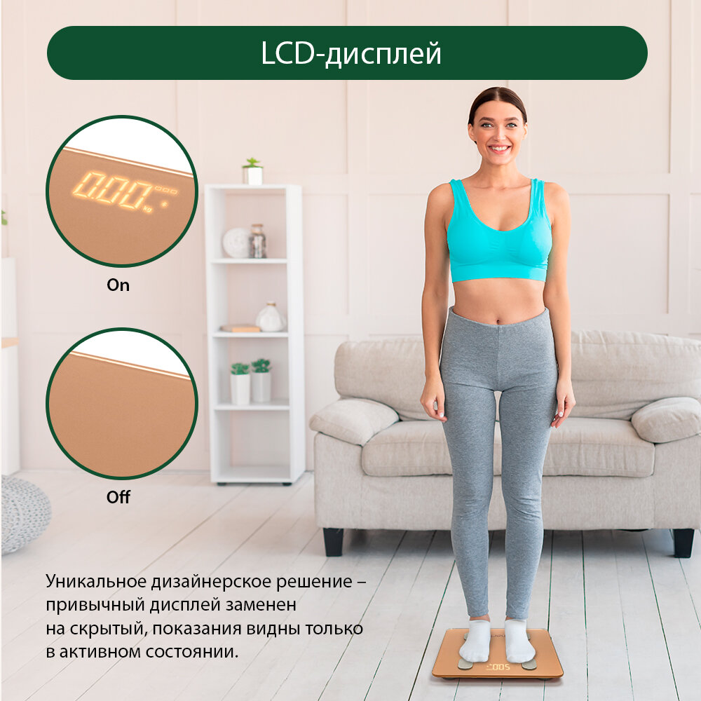 | Дополнительные функции | определение доли жировой ткани / определение доли мышечной ткани / определение доли воды / определение доли костной ткани / расчет ИМТ (BMI) / постановка цели / память |