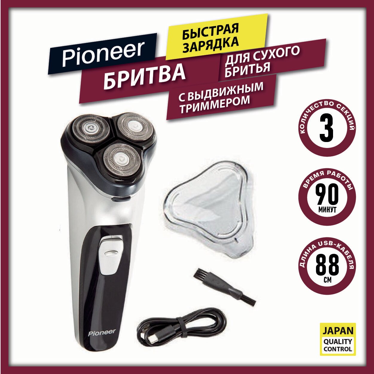 Бритва Pioneer BS005 для сухого бритья с выдвижным триммером, батареей 3,7 В и USB-кабелем, 5 Вт