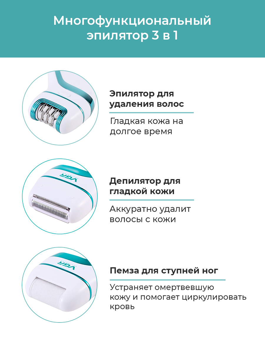 Электроэпилятор VGR V-713 - женский эпилятор с насадками для тела, зоны бикини и лица