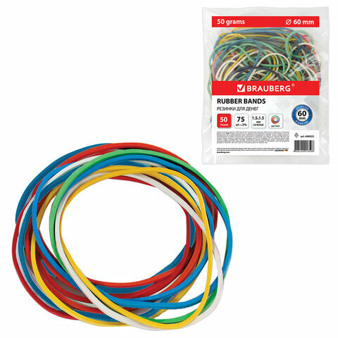 Резинки банковские универсальные диаметром 60 мм, BRAUBERG 50 г, цветные, натуральный каучук, 440035, 440035