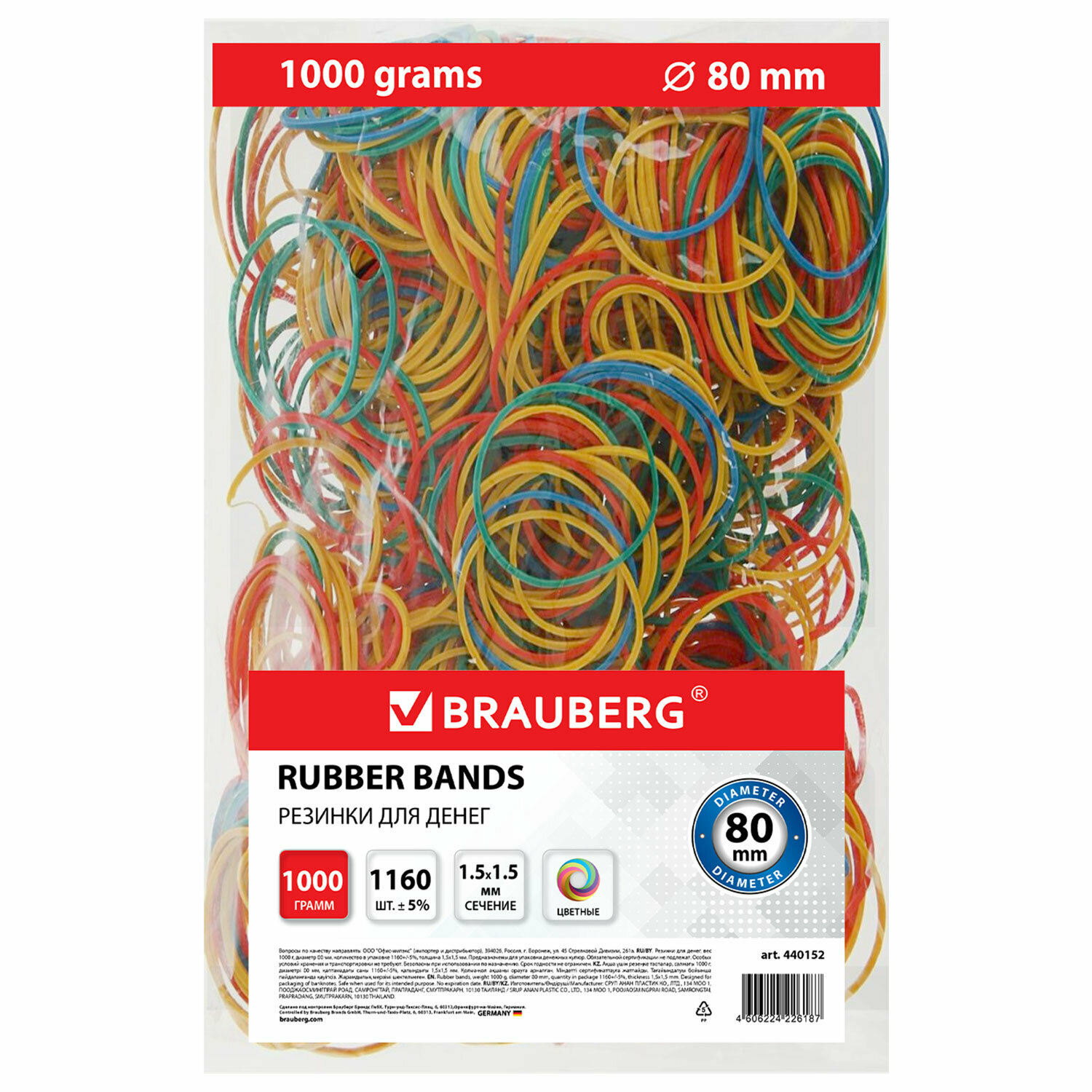 Квант продажи 1 ед. Резинки банковские универсальные диаметром 80 мм, BRAUBERG 1000 г, цветные, натуральный каучук, 440152