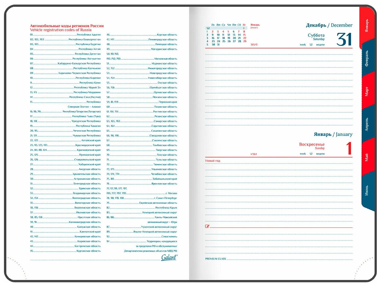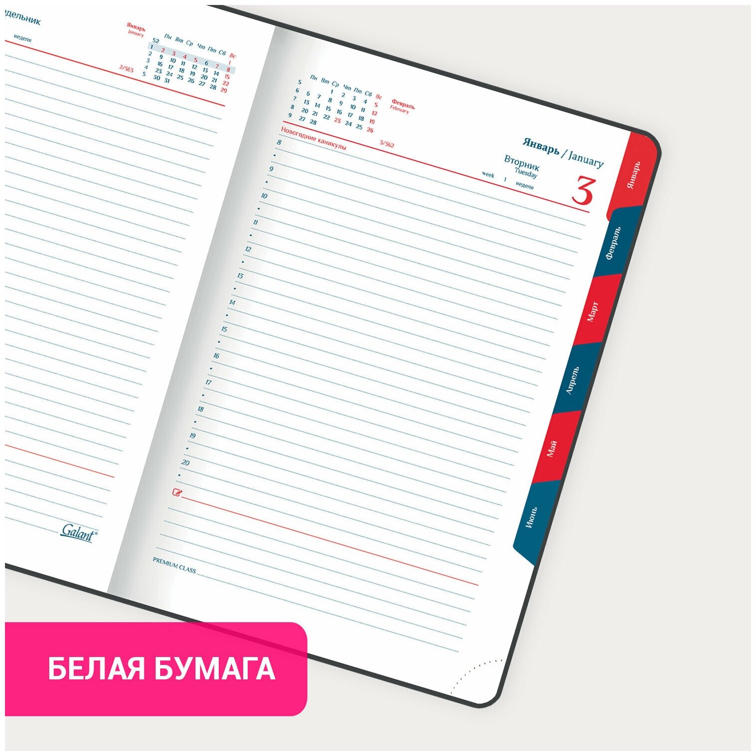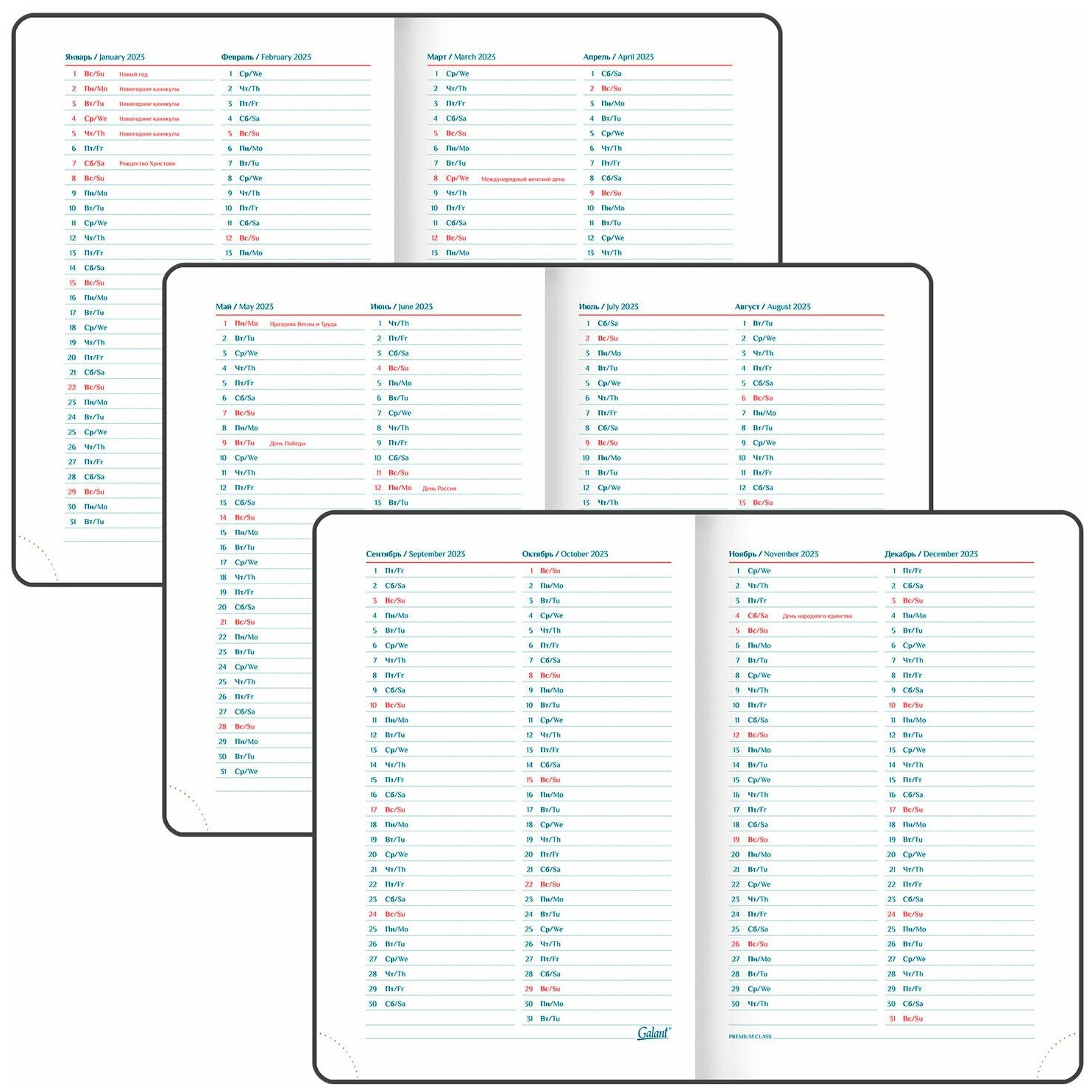 | Особенности | календарь / перфорация уголков / справочная информация / ляссе / прошивка по периметру обложки / закругленные углы / вырубка |