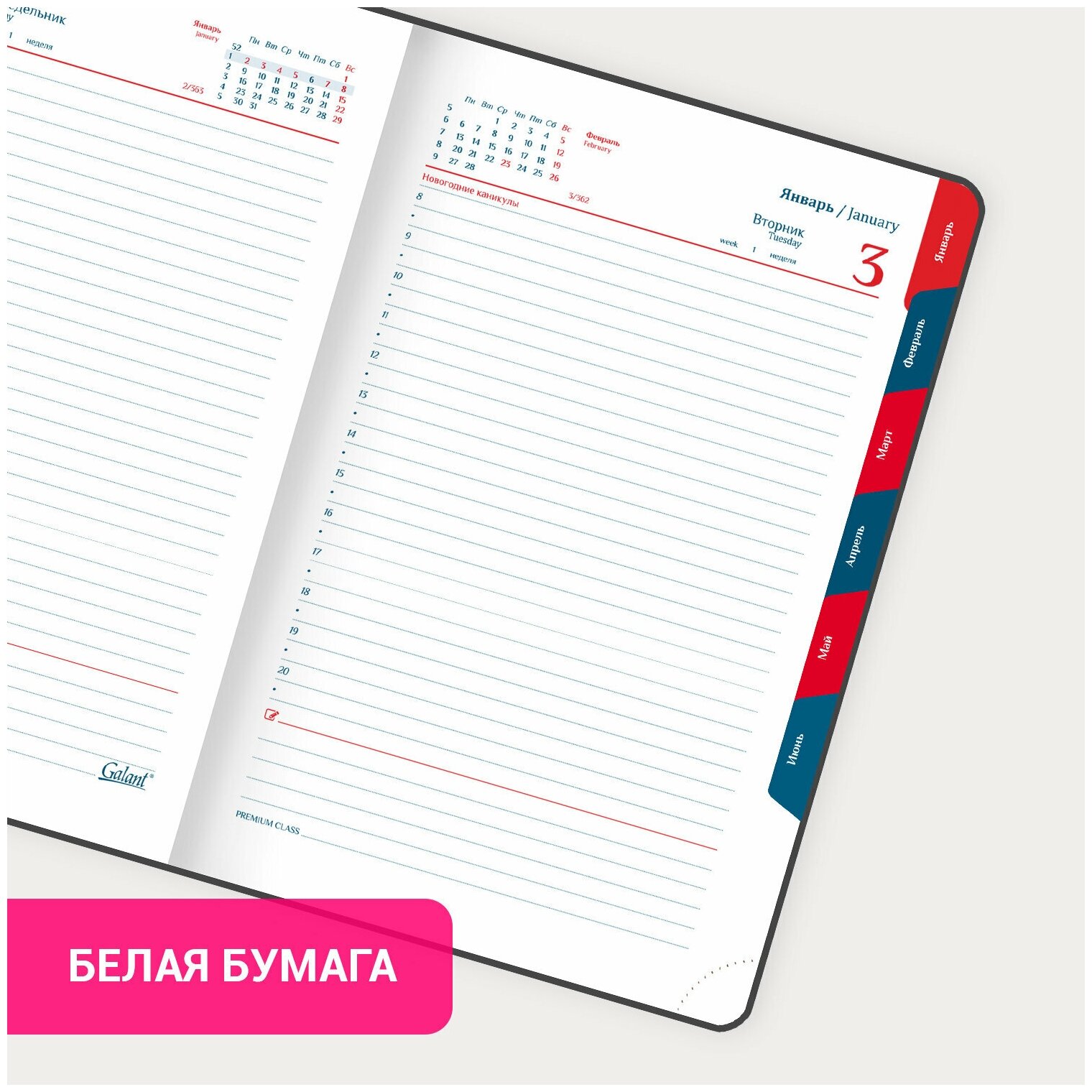 | Особенности | календарь / перфорация уголков / справочная информация / ляссе / прошивка по периметру обложки / закругленные углы / вырубка |