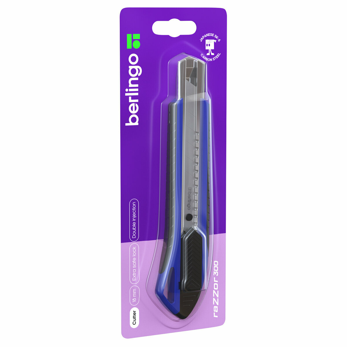 Нож канцелярский 18мм Berlingo "Razzor 300", auto-lock, металл.направл., мягкие вставки, синий, европодвес (арт. 330399)