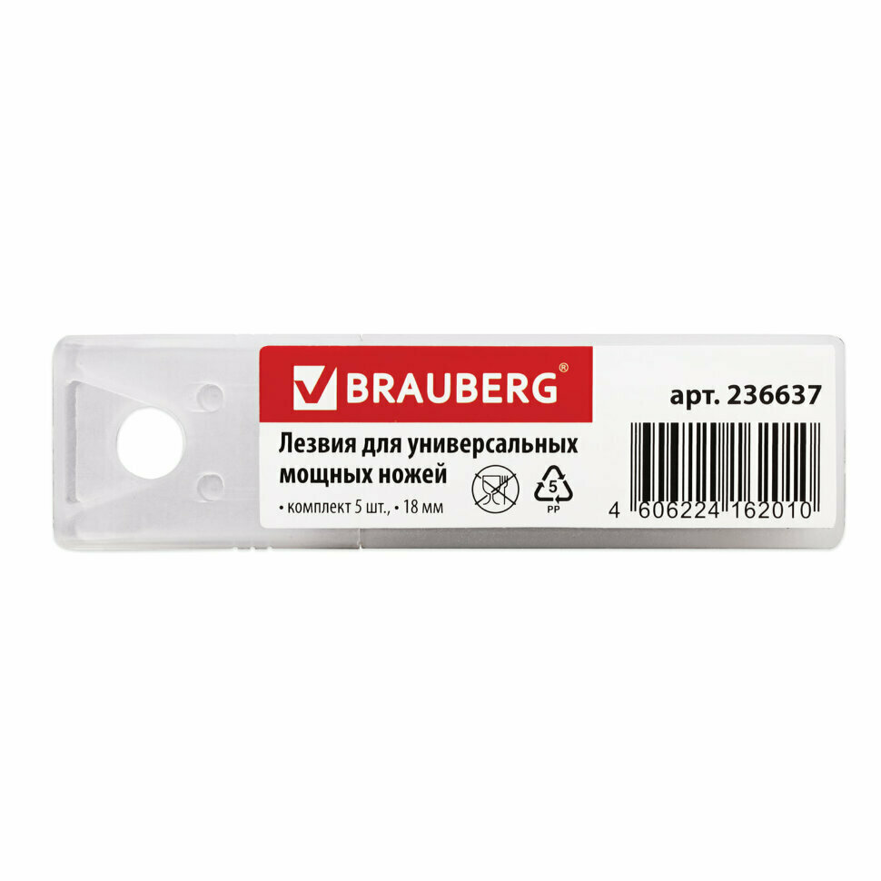BRAUBERG лезвия для универсальных мощных ножей, 18 мм, комплект 5 ШТ, форма-трапеция, 236637