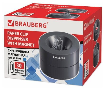 Диспенсер для скрепок / органайзер / скрепочница магнитная Brauberg с 30 скрепками, большой бочонок, черная, 225191