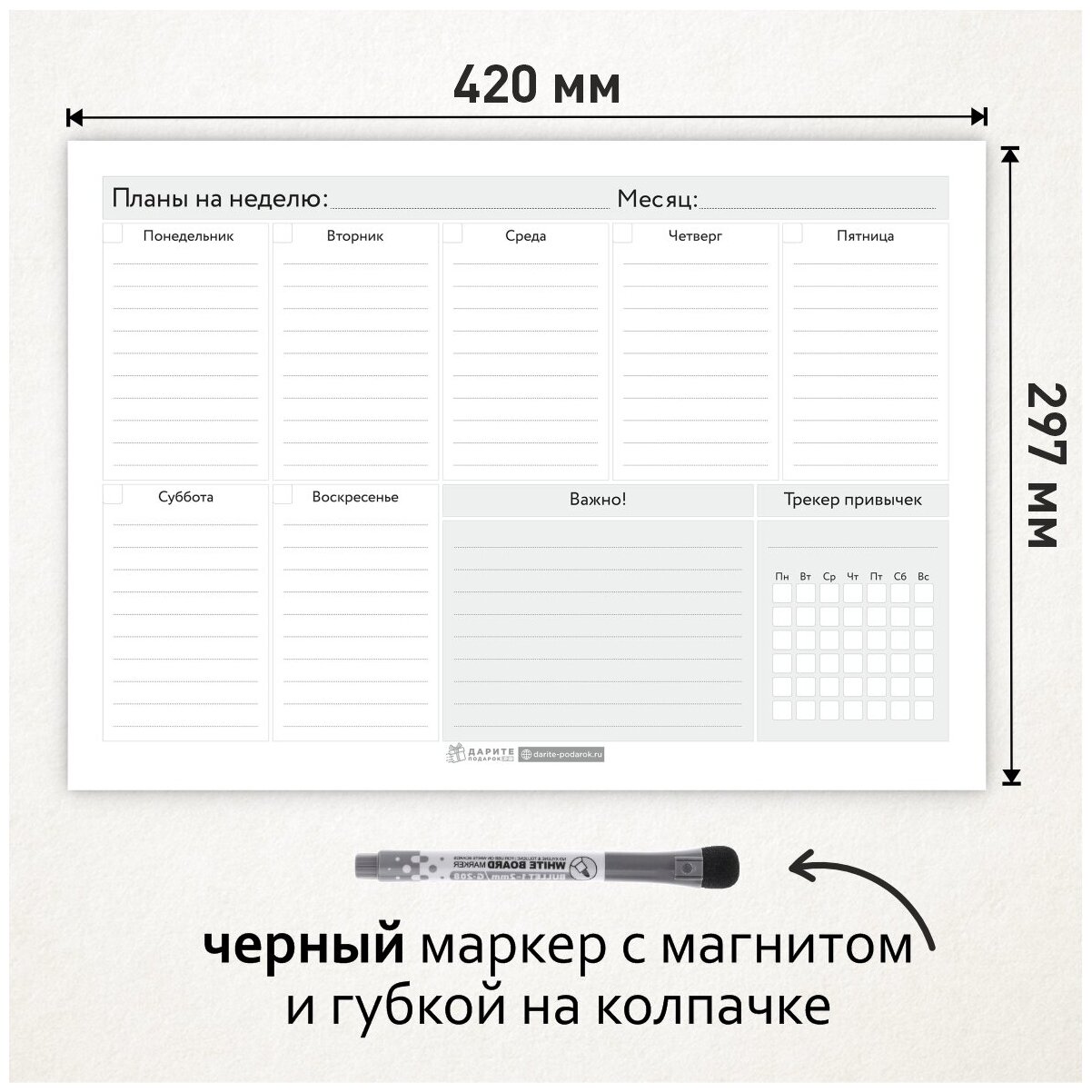 Планер магнитный А3 - на неделю с трекером и важными делами, маркер с магнитом, Бело-серый фон #000 №16, planner_background_white_#000_А3_16 интересное: