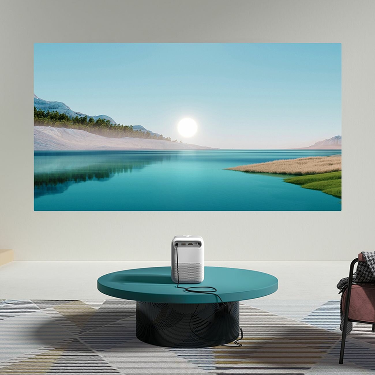 с интернетом дружит идеально, ставятся приложения всех онлайн-кинотеатров, удобный пульт, стильный корпус, весьма тихий. Экран не использовали, обои бежевые с блестящим рисунком - картинка отличная, если не заморачиваться, то не мешает. При постановке сбоку от экрана или ниже, проекция регулируется легко и хорошо, сохраняет настройки при выключении. |