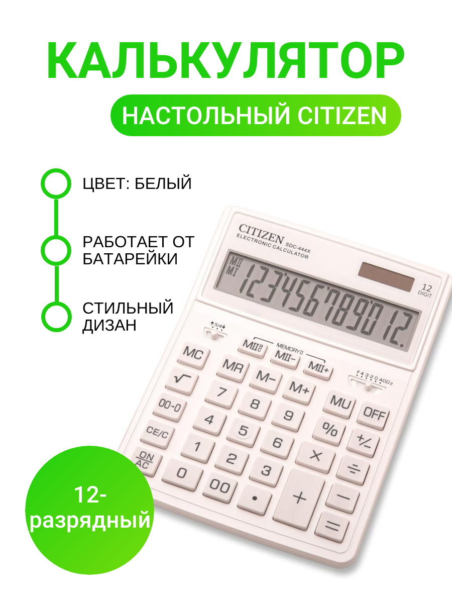 Калькулятор настольный Citizen "SDC-444XRWHE", 12-разрядный, 155 х 204 х 33 мм, двойное питание, белый