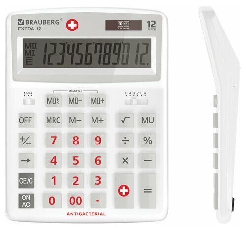 Калькулятор настольный BRAUBERG EXTRA-12-WAB (206x155 мм),12 разрядов, двойное питание, антибактериальное покрытие, белый, 250490 - 1 шт.