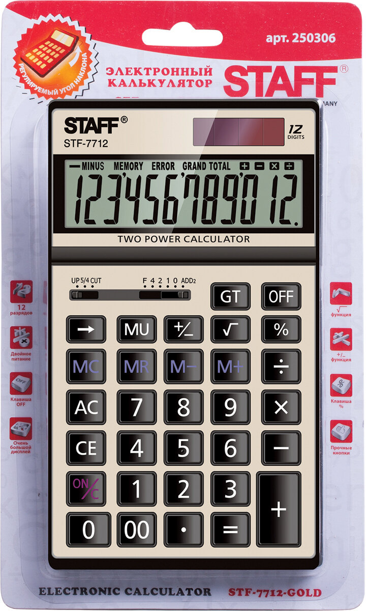 Купить Калькулятор настольный металлический STAFF STF-7712-GOLD (179х107 мм), 12 разрядов, двойное питание, блистер, 250306