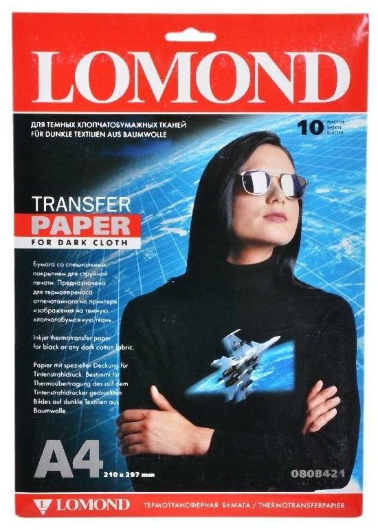 Lomond Бумага термотрансферная А4, для тёмных тканей, 10 листов LOMOND, 140 г/м2 (0808421)