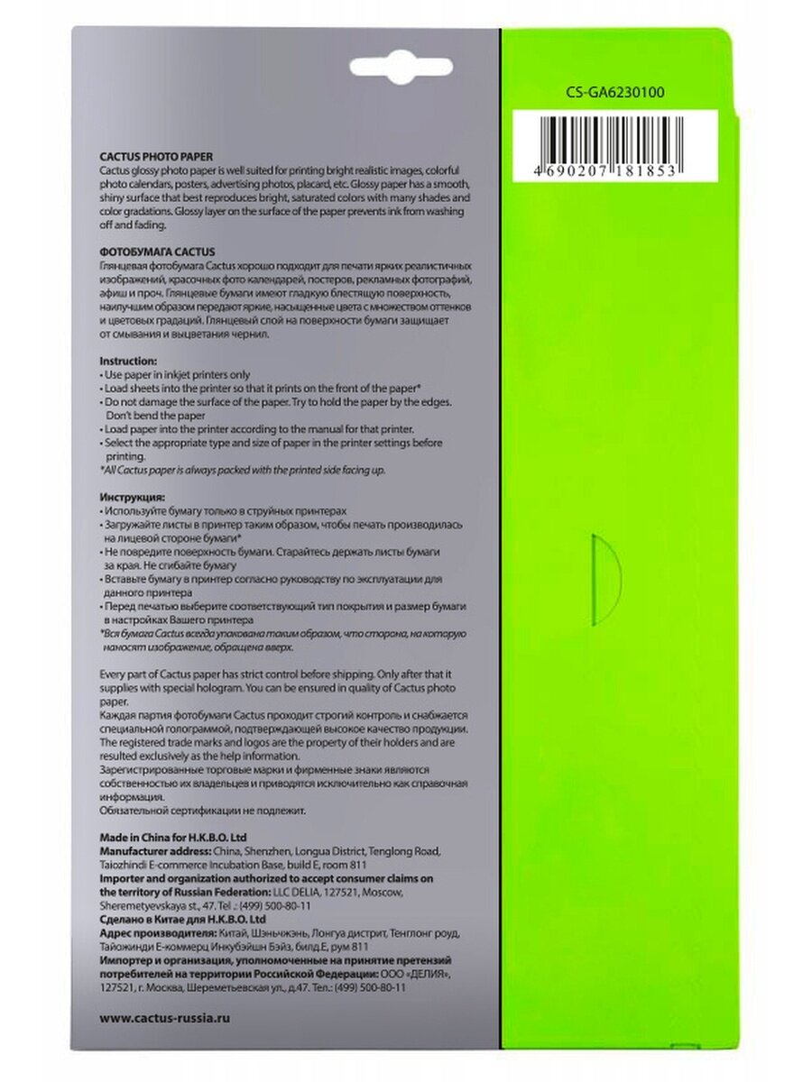 Фотобумага CACTUS CS-GA6230100 глянцевая 10x15/230г/м2/100л