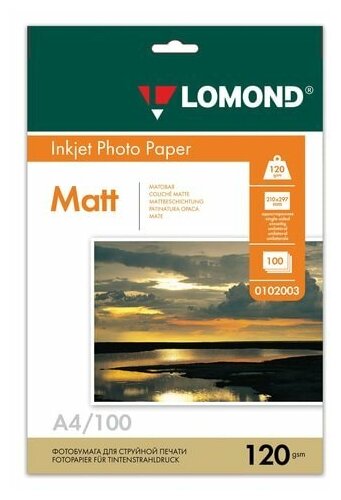 Фотобумага матовая, А4, 120 г/м2, односторонняя, 100 листов, LOMOND, 0102003 1 шт .