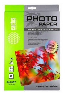 Фотобумага для струйной печати А5, 50 листов Cactus, 180 г/м2, односторонняя, глянцевая