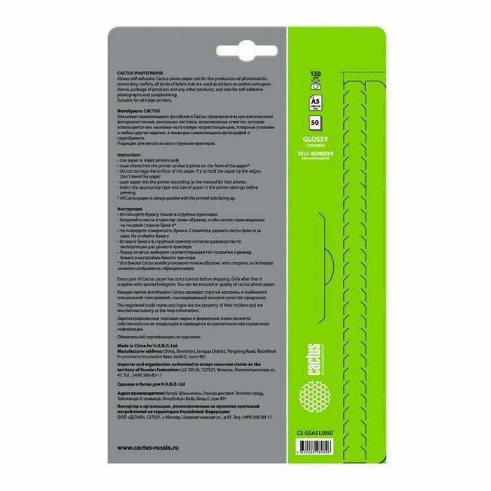 Ниже Вы можете прочитать отзывы на Фотобумага Cactus CS-GSA513050 A5/130г/м2/50л. глянцевое самоклей. для струйной печати, ознакомится с подробными характеристиками, посмотреть интересные обзоры и фотографии на Фотобумага Cactus CS-GSA513050 A5/130г/м2/50л. глянцевое самоклей. для струйной печати.
